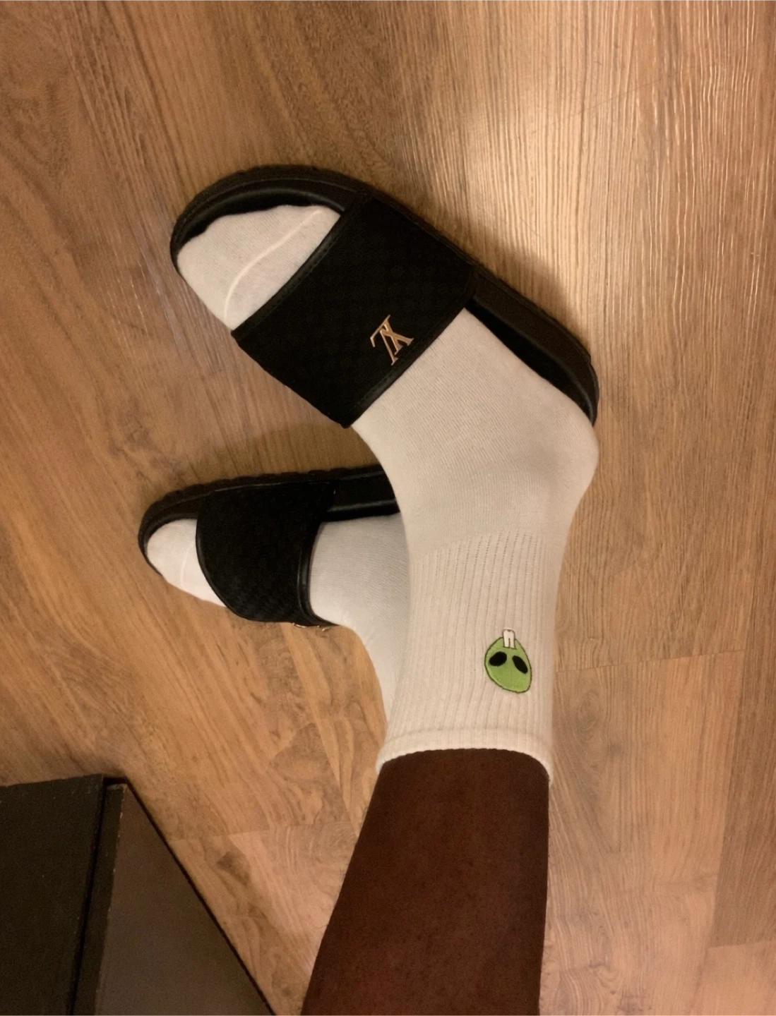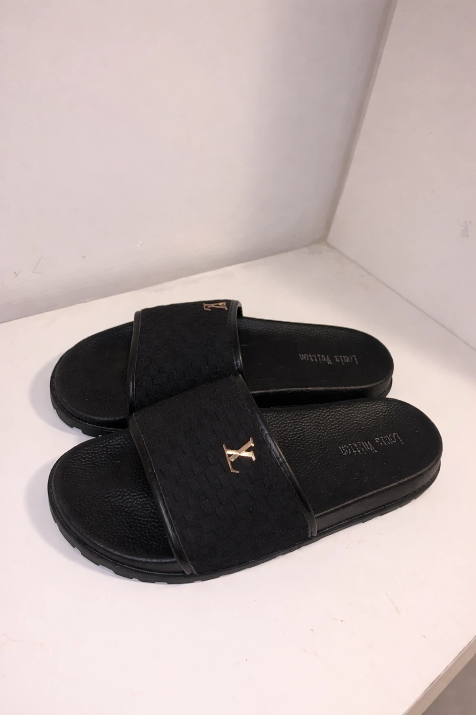 Black Louis Vuitton slides. Classic monogram pattern on the strap. Comfortable and stylish for everyday wear.