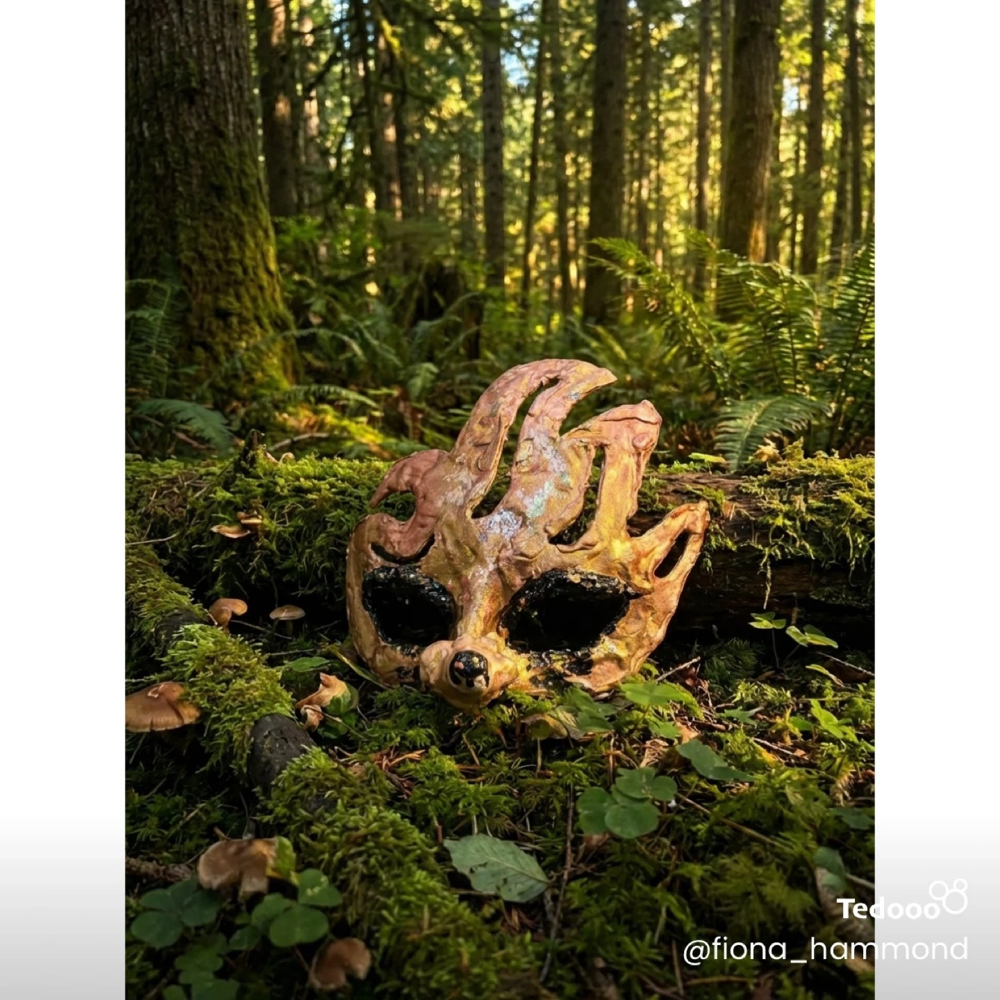 This unique fox mask is handcrafted with a rustic, earthy design. It features textured details and decorative trim around the eyes. This piece would make a striking decorative item or a costume accessory!