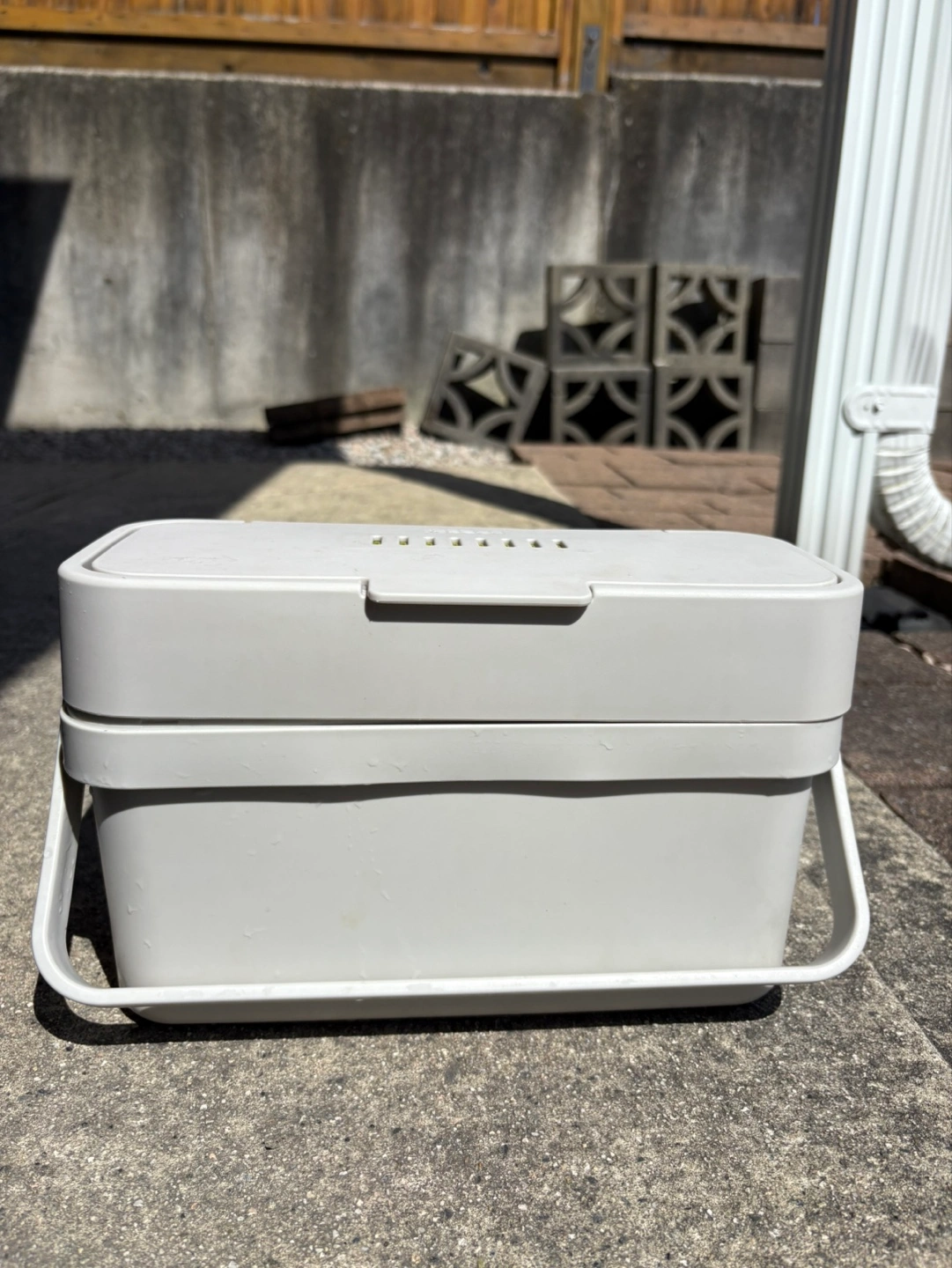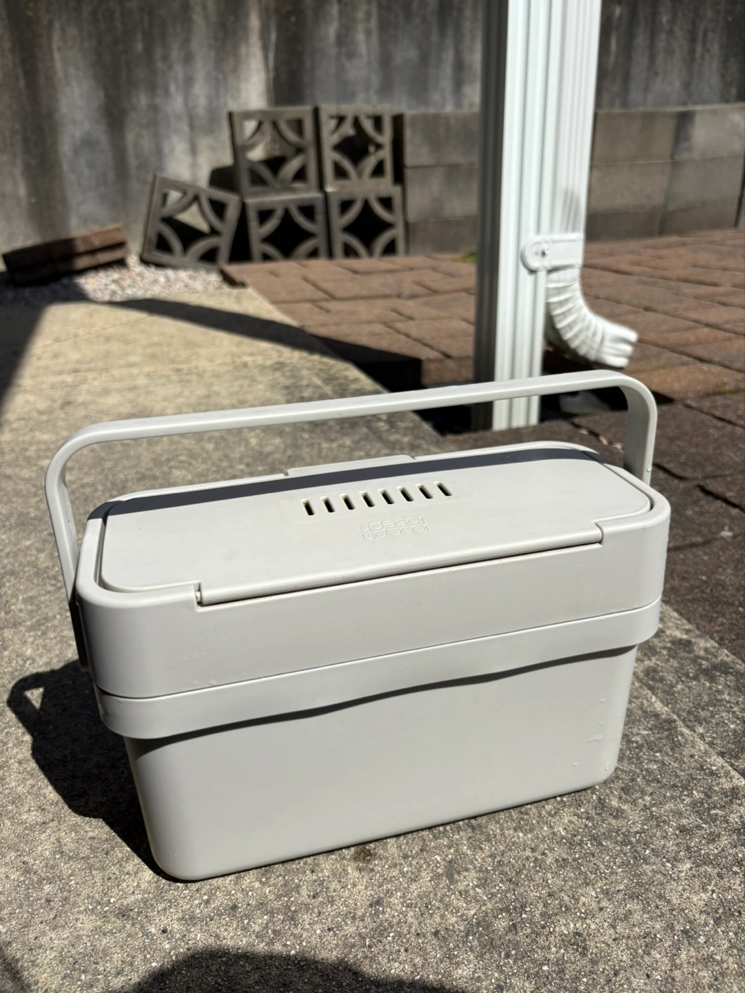 Joseph Joseph minimal design compost bin. Features a carrying handle and lid.