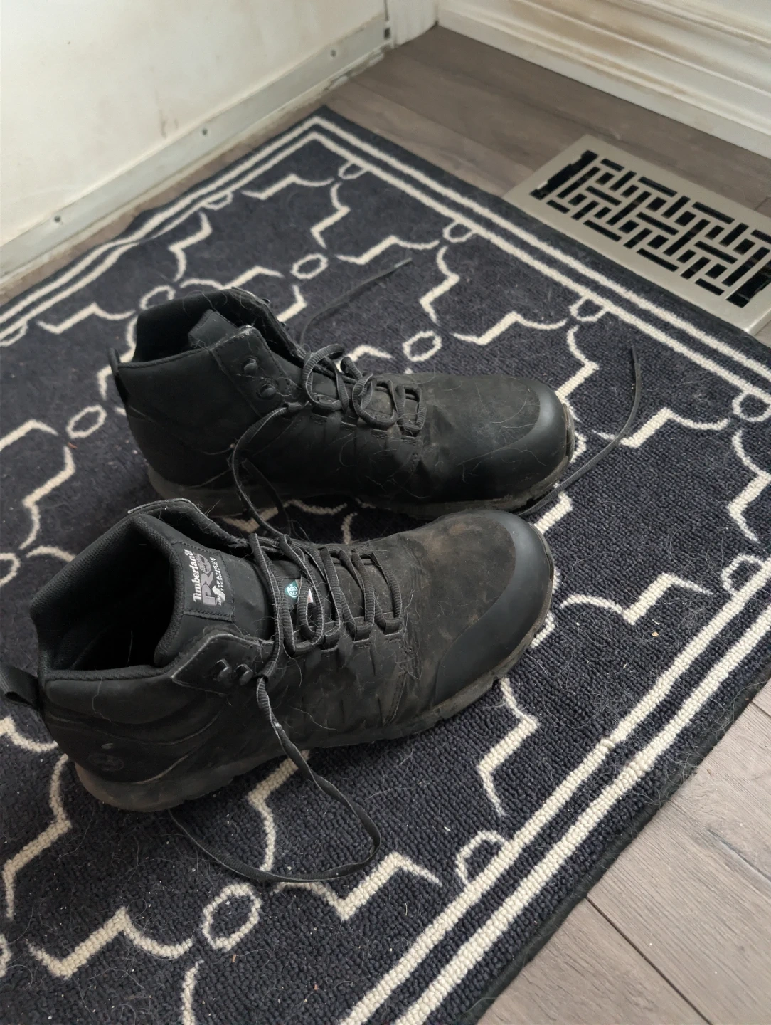 Timberland PRO black work boots. These boots are designed for comfort and durability on the job. They feature a sturdy construction and a secure lace-up closure. Suitable for various work environments. Worn a handful of times but my husband didn't find them comfortable as he purchased the wrong size.