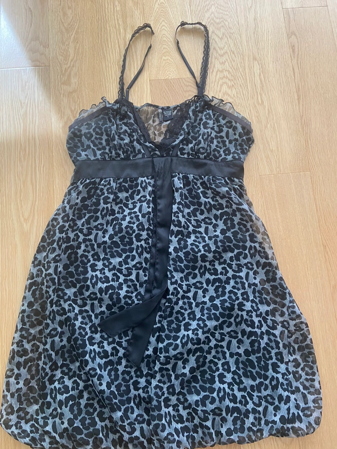Sheer leopard print cami dress. Features thin straps, a satin ribbon accent at the waist, and a ruffled neckline. Relaxed fit.