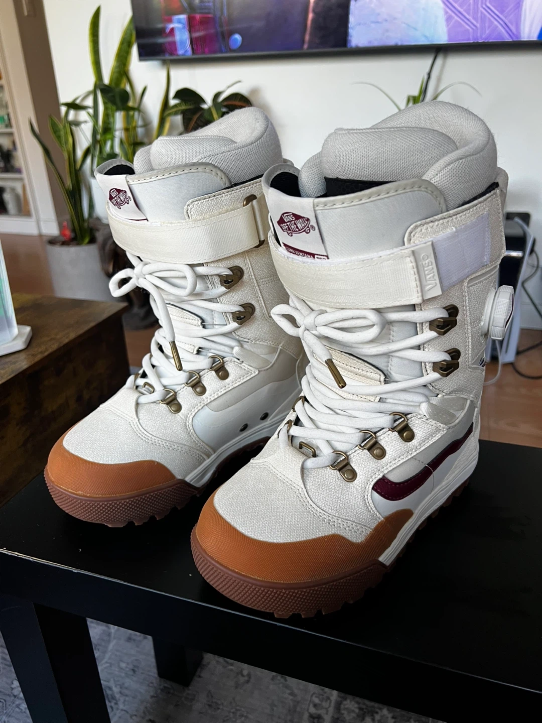Vans snowboard boots with Boa closure system. Features Ultracush Smartwool lining. Cream and maroon colourway.