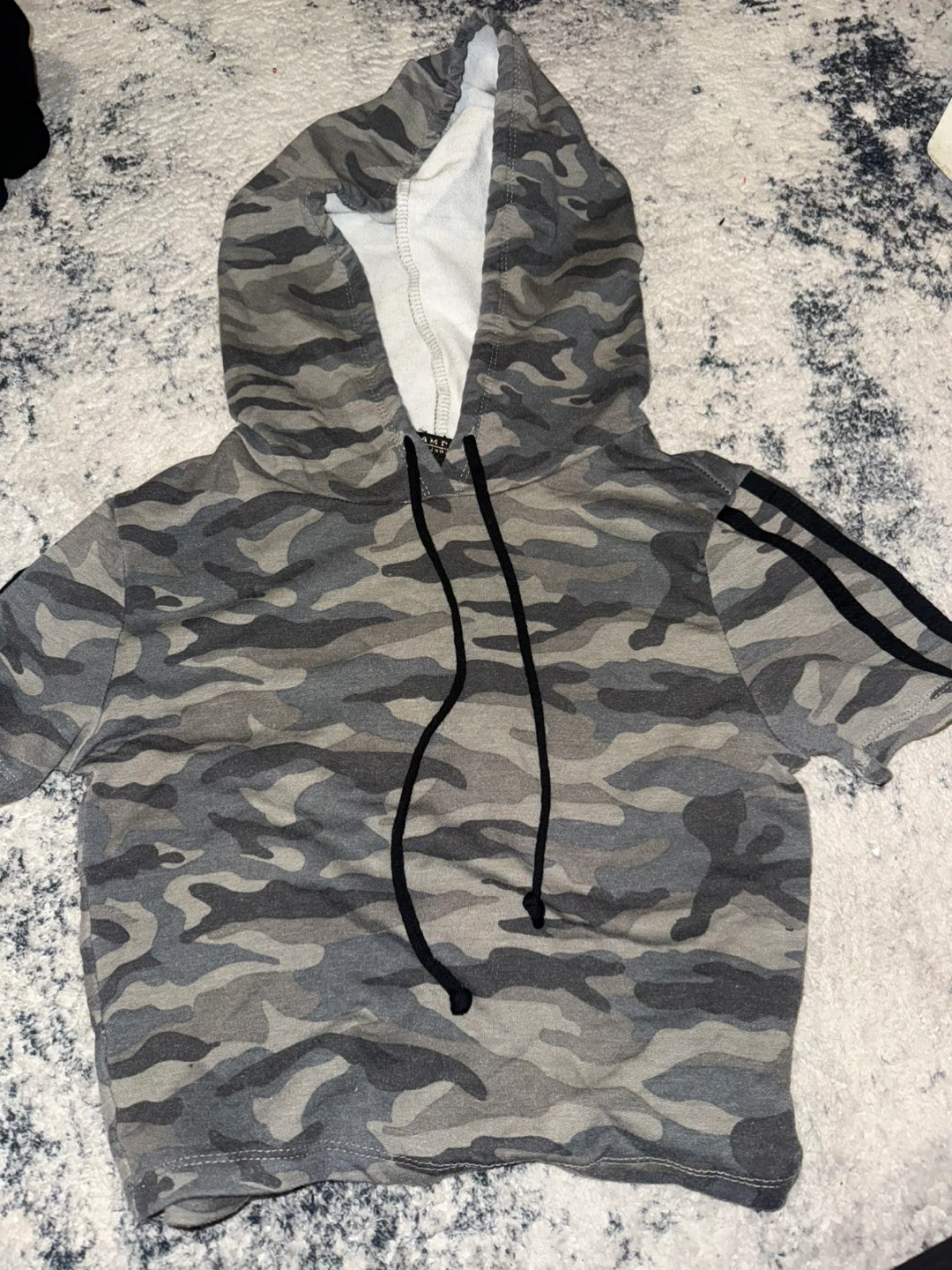 This REVAMPED CO. cropped hoodie features a cool camouflage print. It's a size small with black stripe detailing on the sleeves. Made in China.