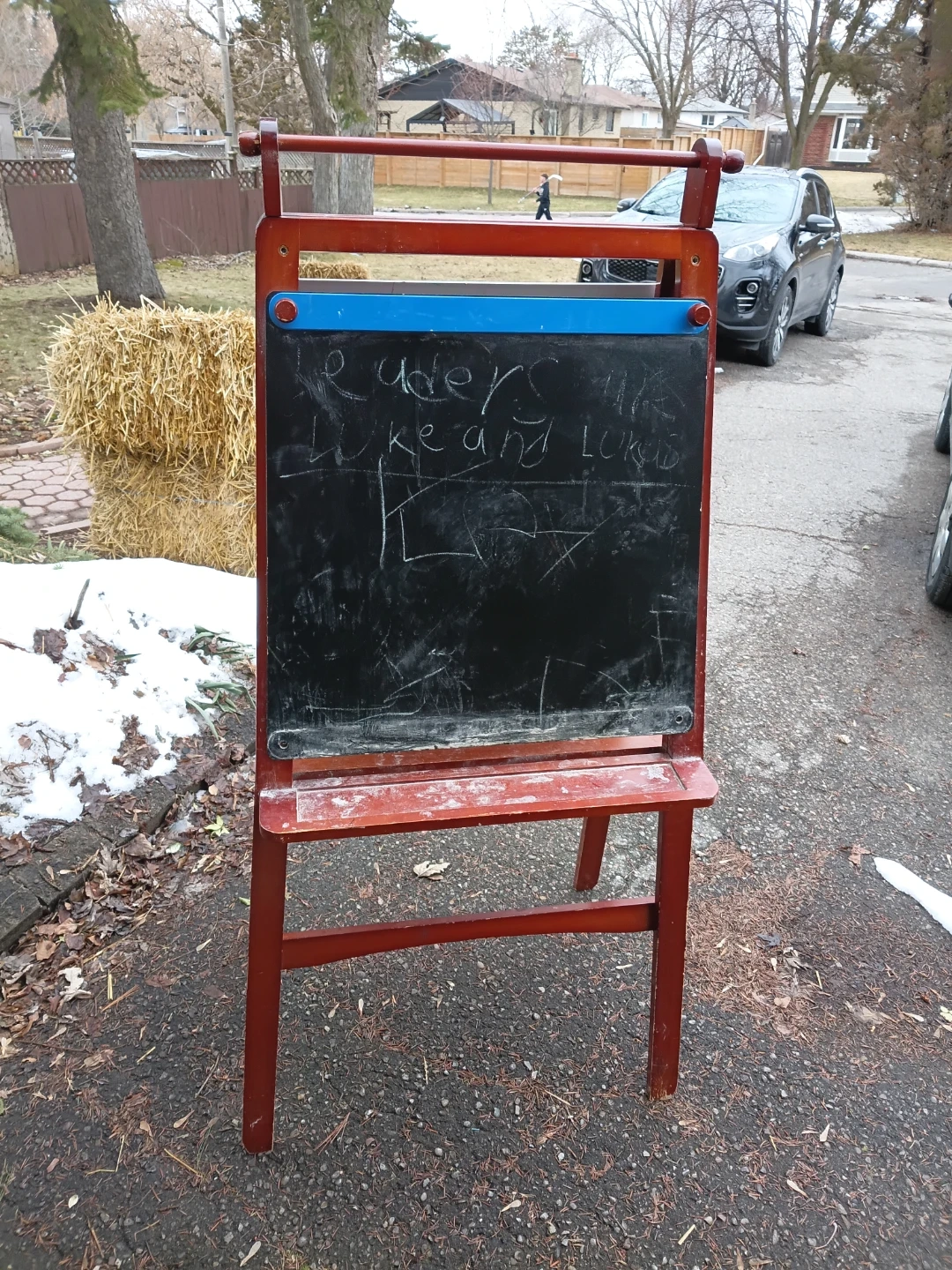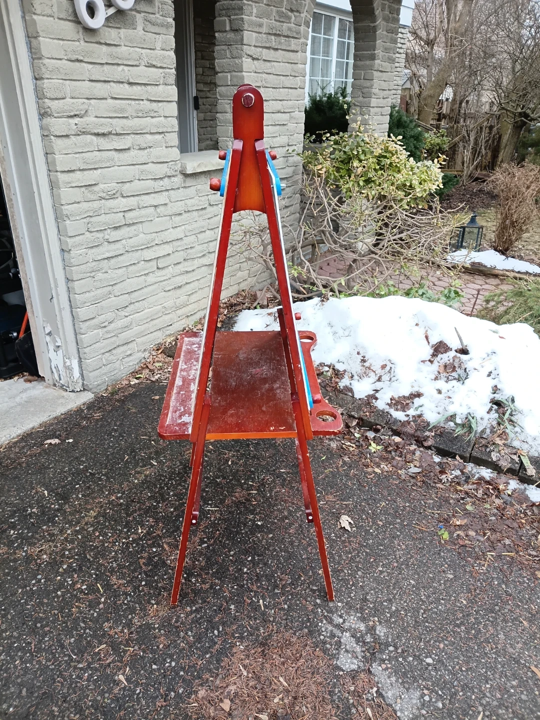 A versatile wooden easel featuring a whiteboard on one side and a chalkboard on the other. It has a convenient shelf for art supplies. This easel is great for encouraging creativity in kids!