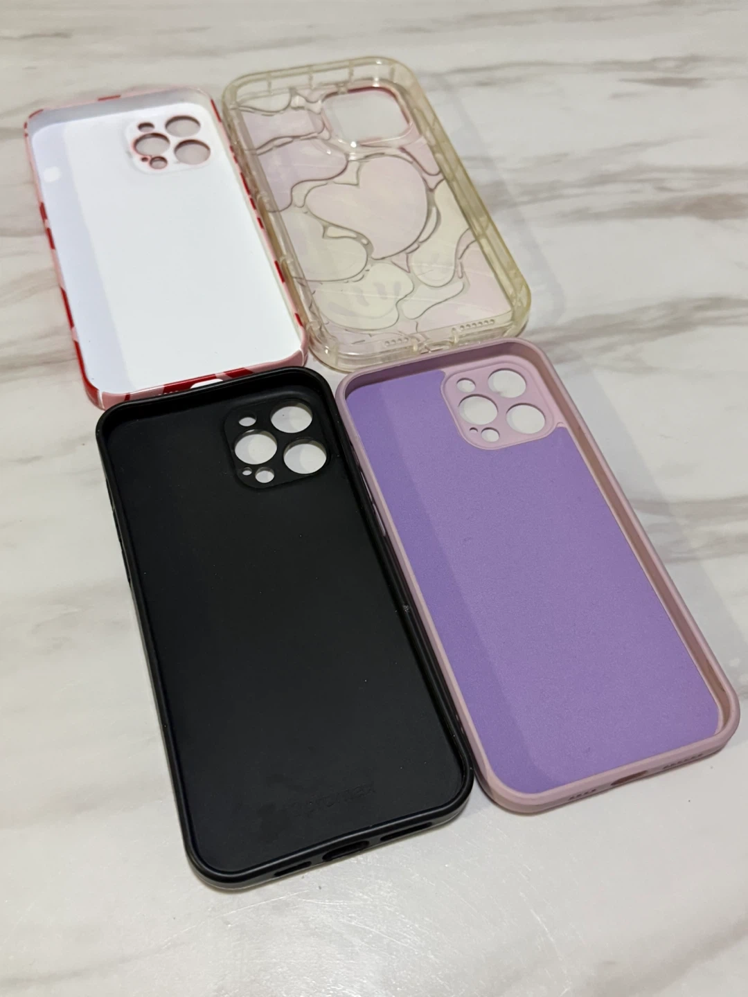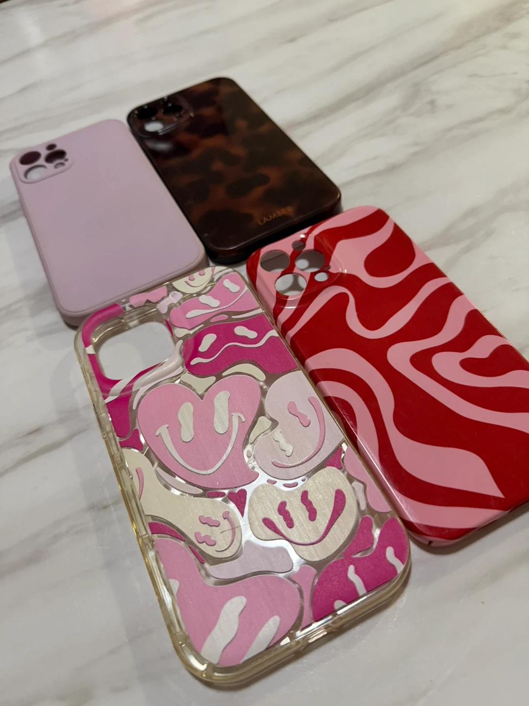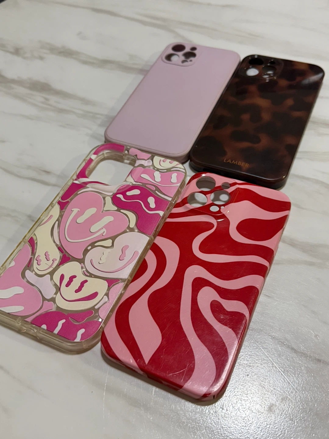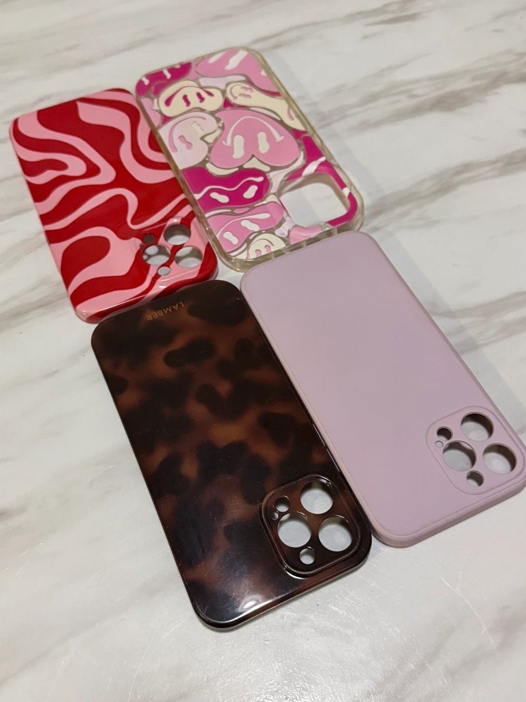 Includes a tortoise shell case with "LAMBER" branding, a purple silicone case, a clear case with smiley faces, and a red wavy pattern case. These cases fit the iPhone 12 Pro Max model. $20 for all 4 cases. Used.