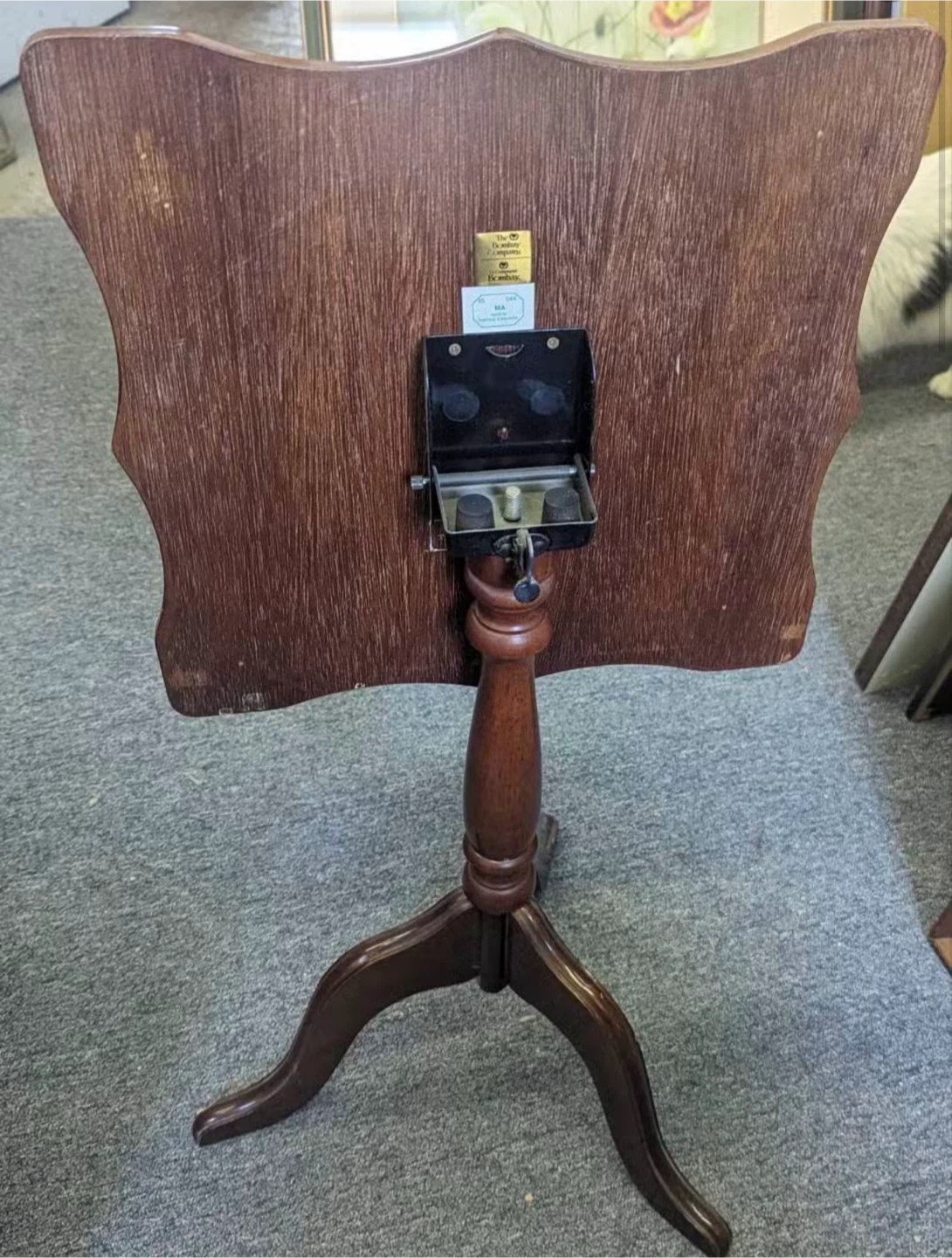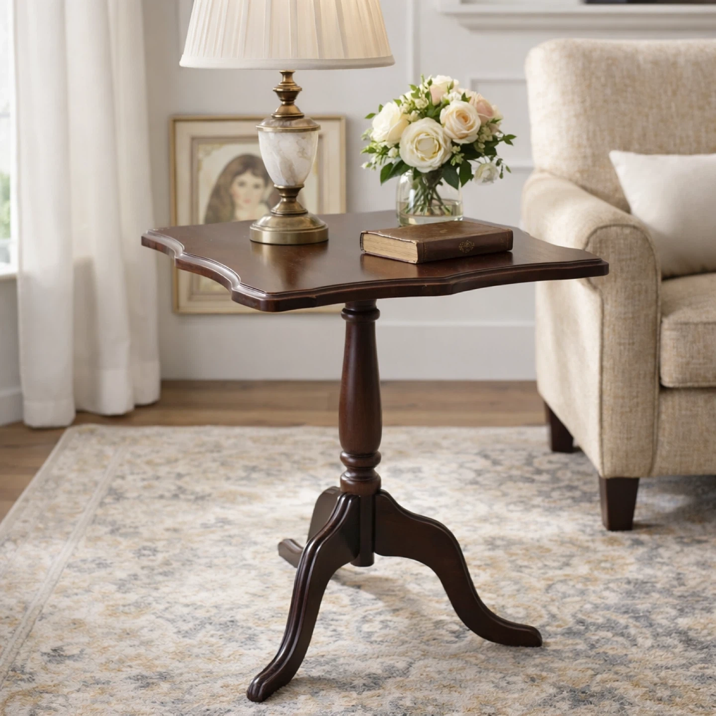 This is a lovely accent table from The Bombay Company. It's made of dark wood and features a classic pedestal base with three legs. The table has a scalloped edge top, perfect for displaying a lamp or decorative items. It's a great size for small spaces or to tuck into a corner!
