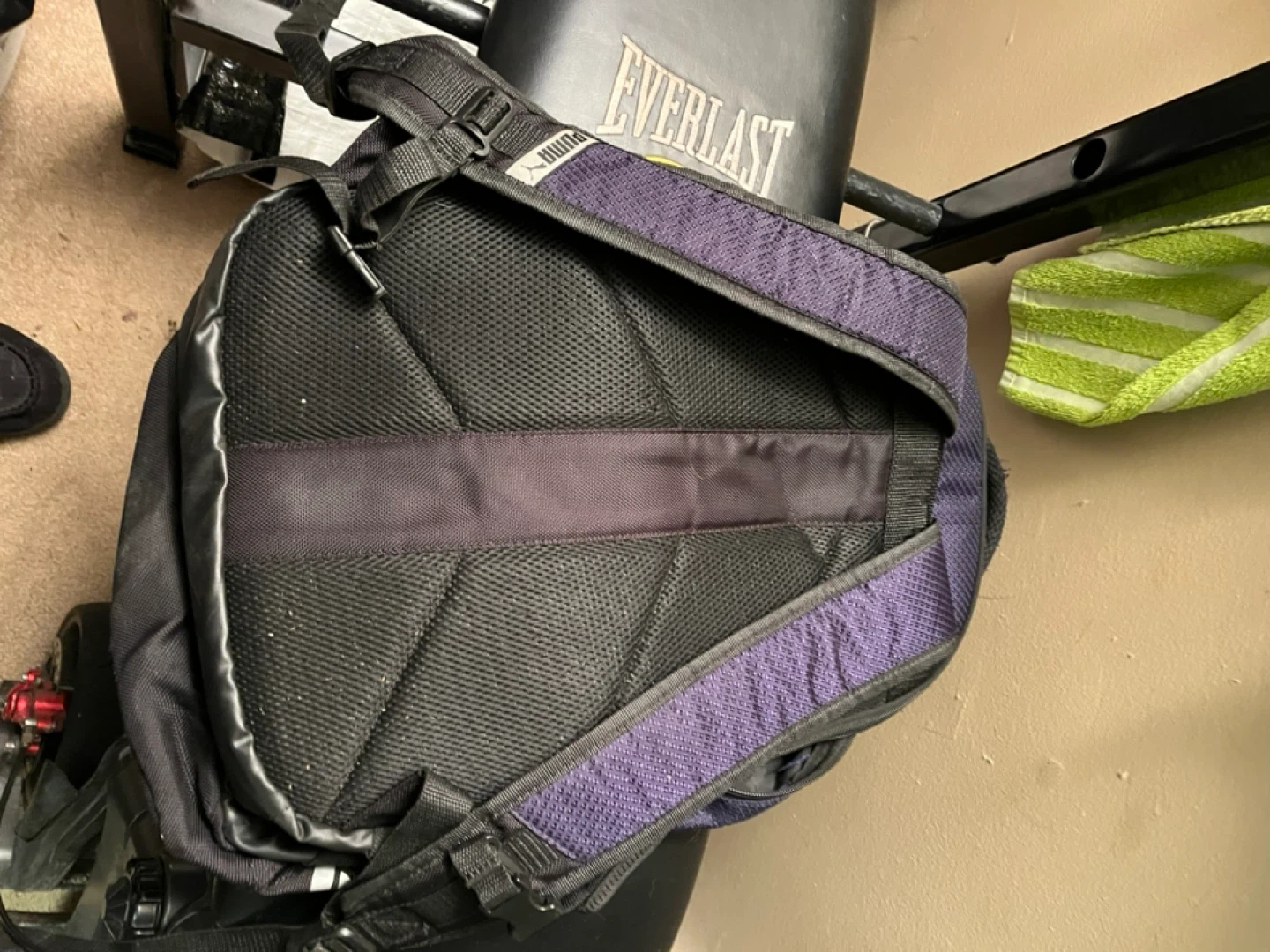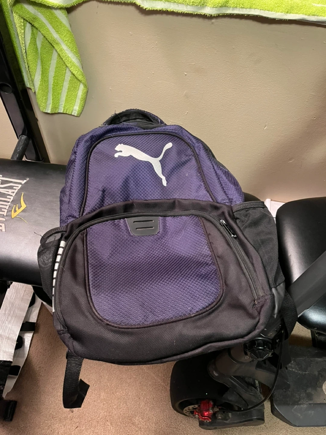 This is a purple and black Puma backpack. It has a padded back and adjustable shoulder straps. Plenty of room for your everyday essentials!
