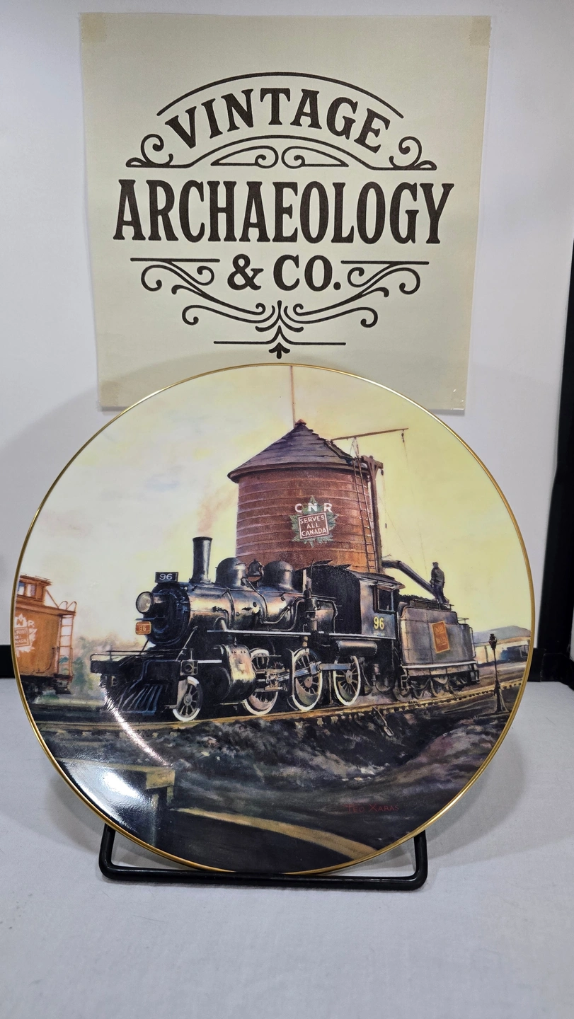 This collector plate was produced in 1989 as part of the 'Steam on the CPR' series celebrating the Canadian Pacific Railway's steam locomotive era. The series was created by artist Theodore A. Xaras and manufactured by Christian Bell Porcelain, commemorating iconic moments in Canadian railway history.