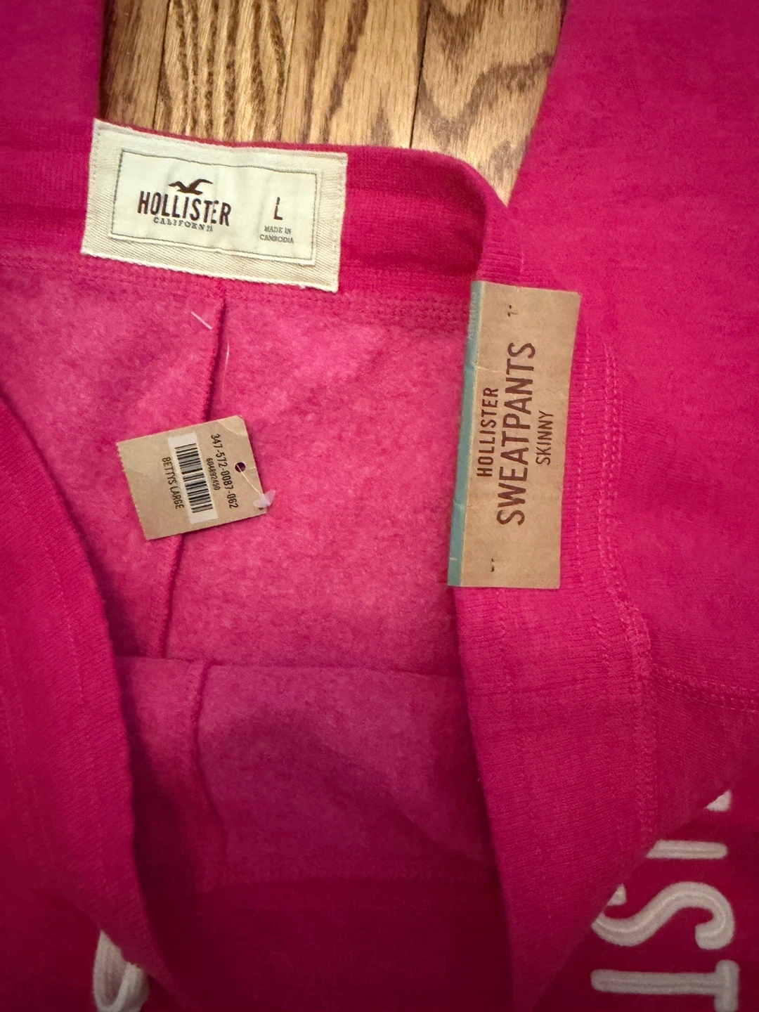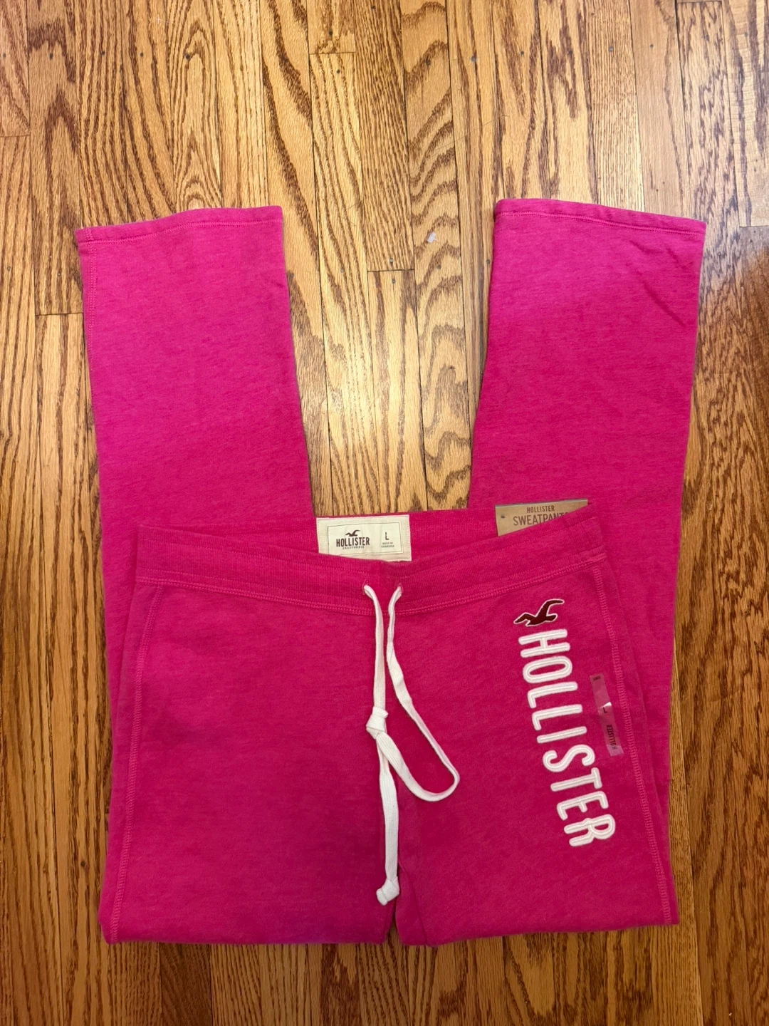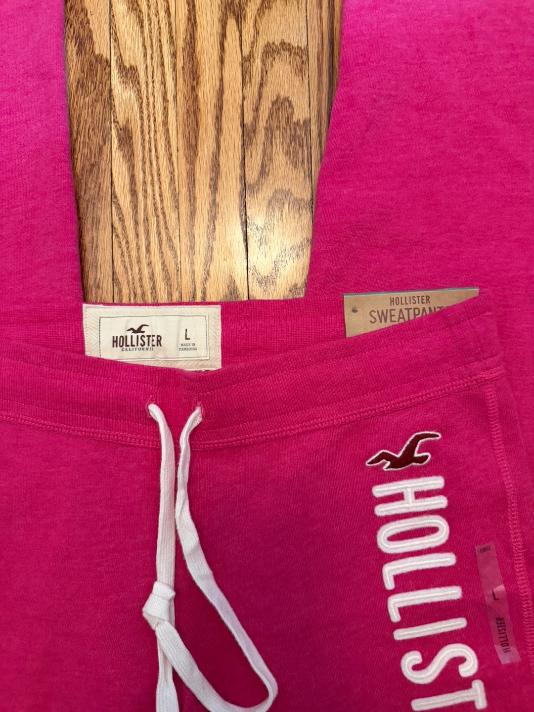 These are bright pink sweatpants from Hollister. They're a size large with a drawstring waist. Features the Hollister logo down the left leg.
