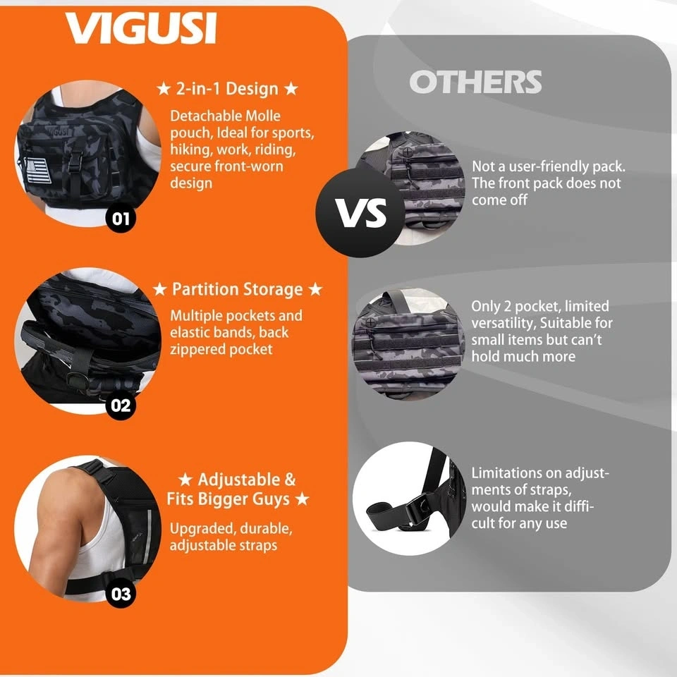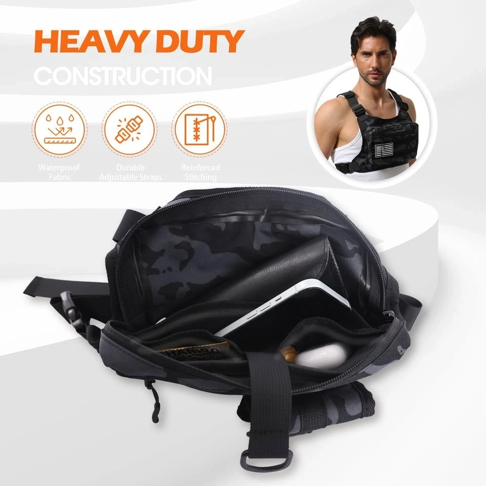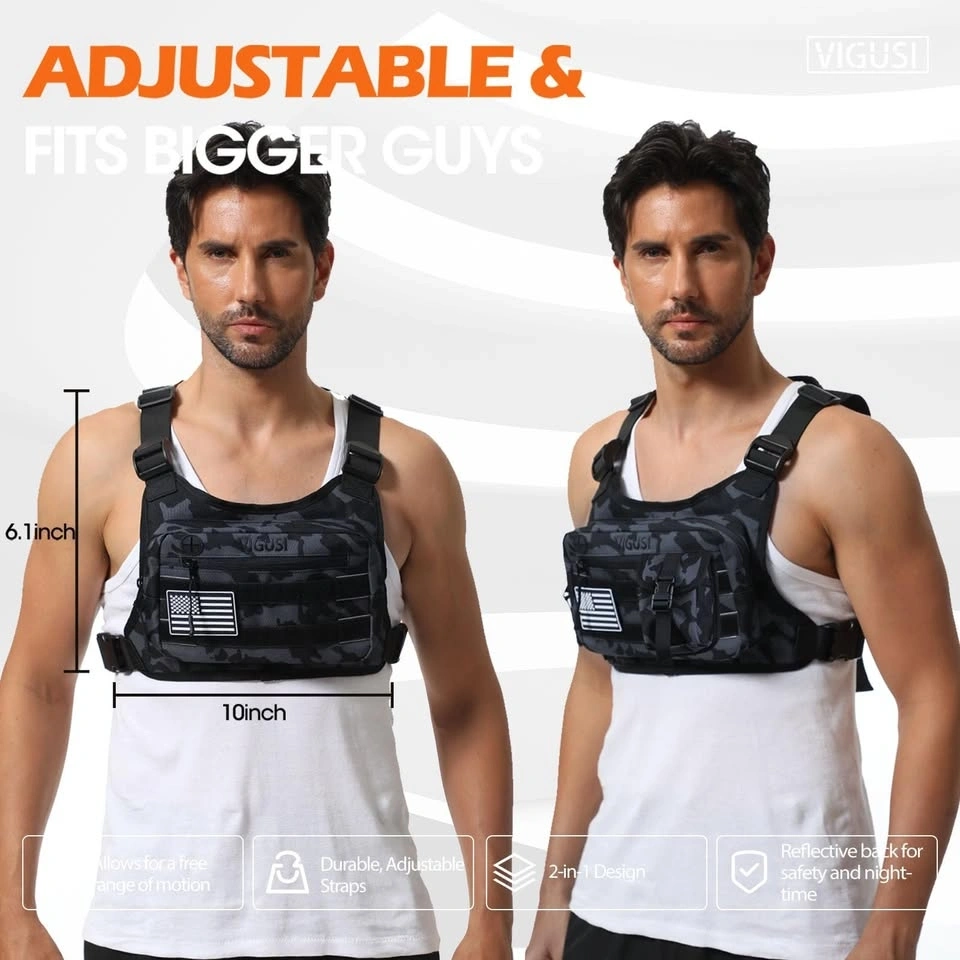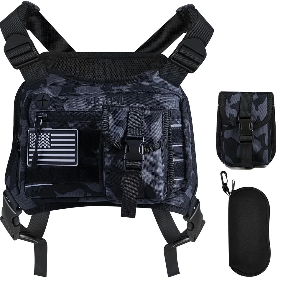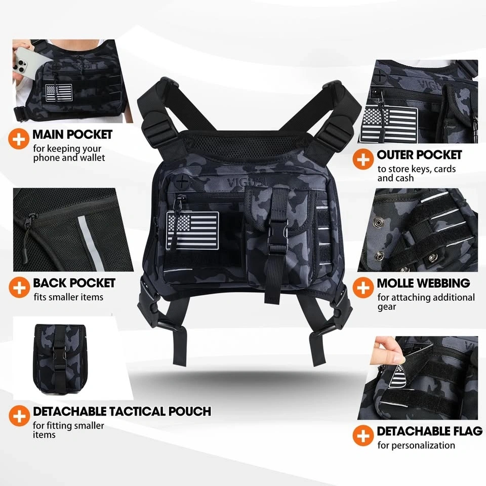 Versatile VIGUSI chest rig bag, new in black camo. Super cool 2-in-1 design with a detachable molle pouch, perfect for sports, hiking, work, or riding. Has tons of storage with multiple pockets, elastic bands, and a back zippered pocket. Straps are adjustable so it fits bigger guys too. Comes with a laser-cut USA flag patch and an abrasion-resistant eyeglasses case. Measures about 6.1 inches tall and 10 inches wide. Also has a reflective back for safety at night. Really useful for keeping your stuff close!