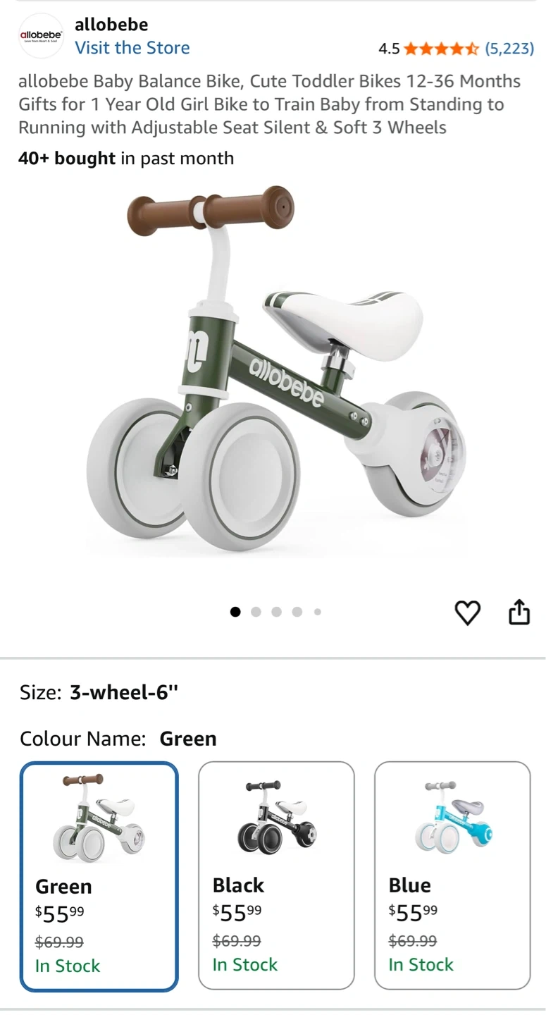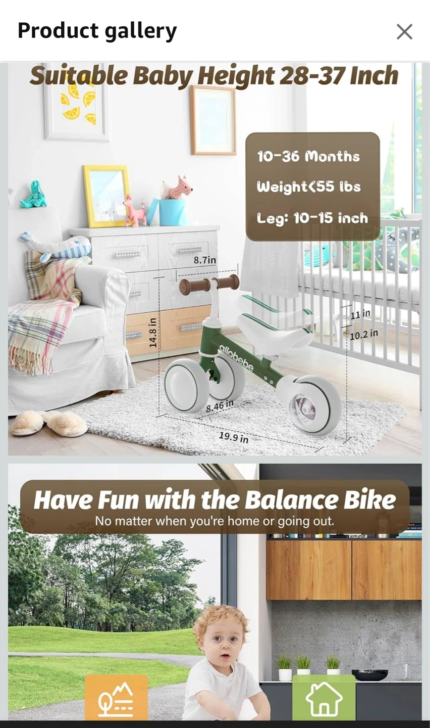 This is an Allobebe baby balance bike in green. It's suitable for toddlers aged 10-36 months. The bike weighs only 3.85 lbs and is easy to carry.