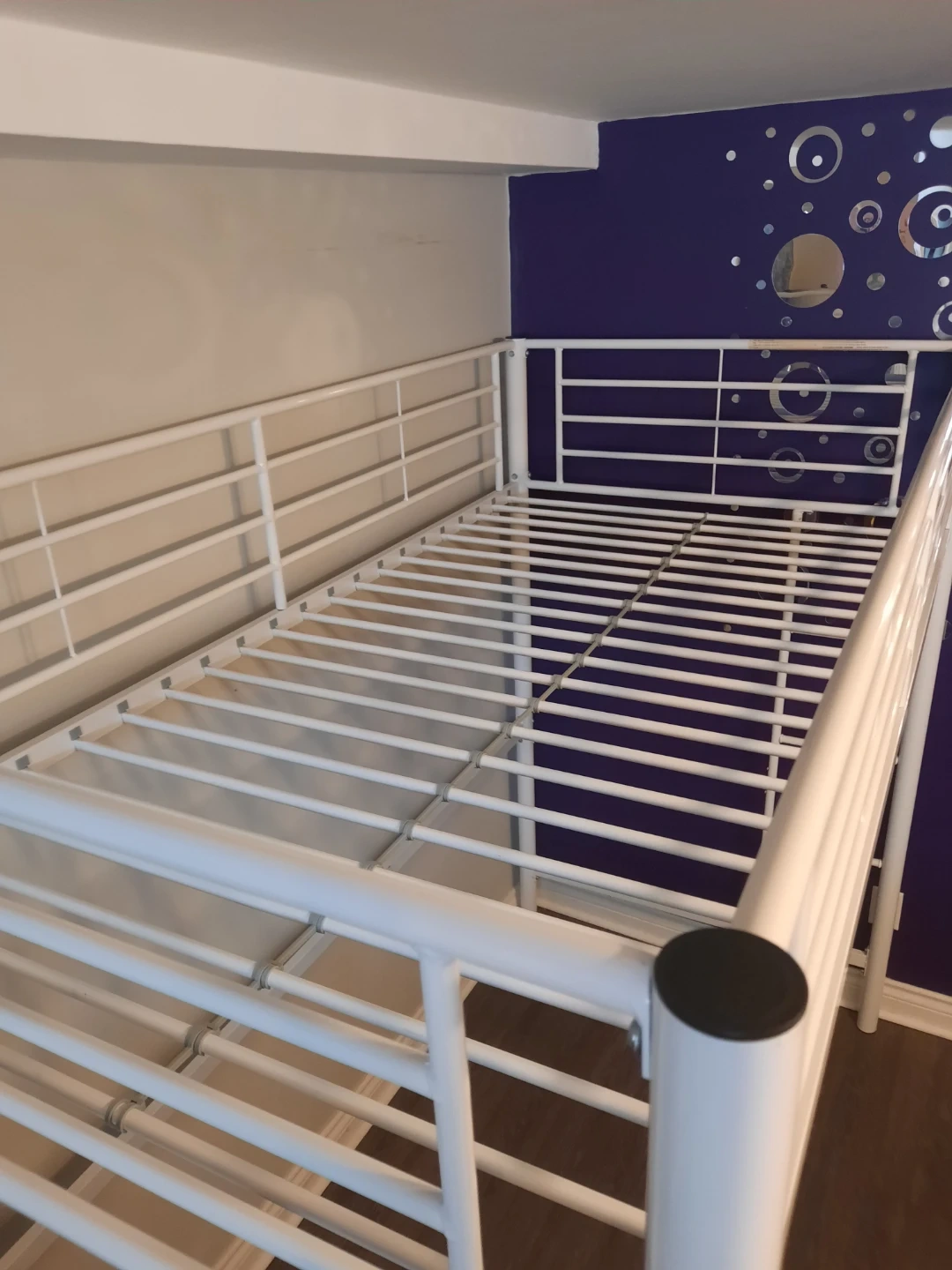 White metal loft bed frame from Walker Edison. Includes safety rails and ladder. Mattress not included. It's perfect for freeing up floor space in smaller rooms. Used for 6 months, bought brand new for $200. Will come disassembled, instructions available online, will share the link.