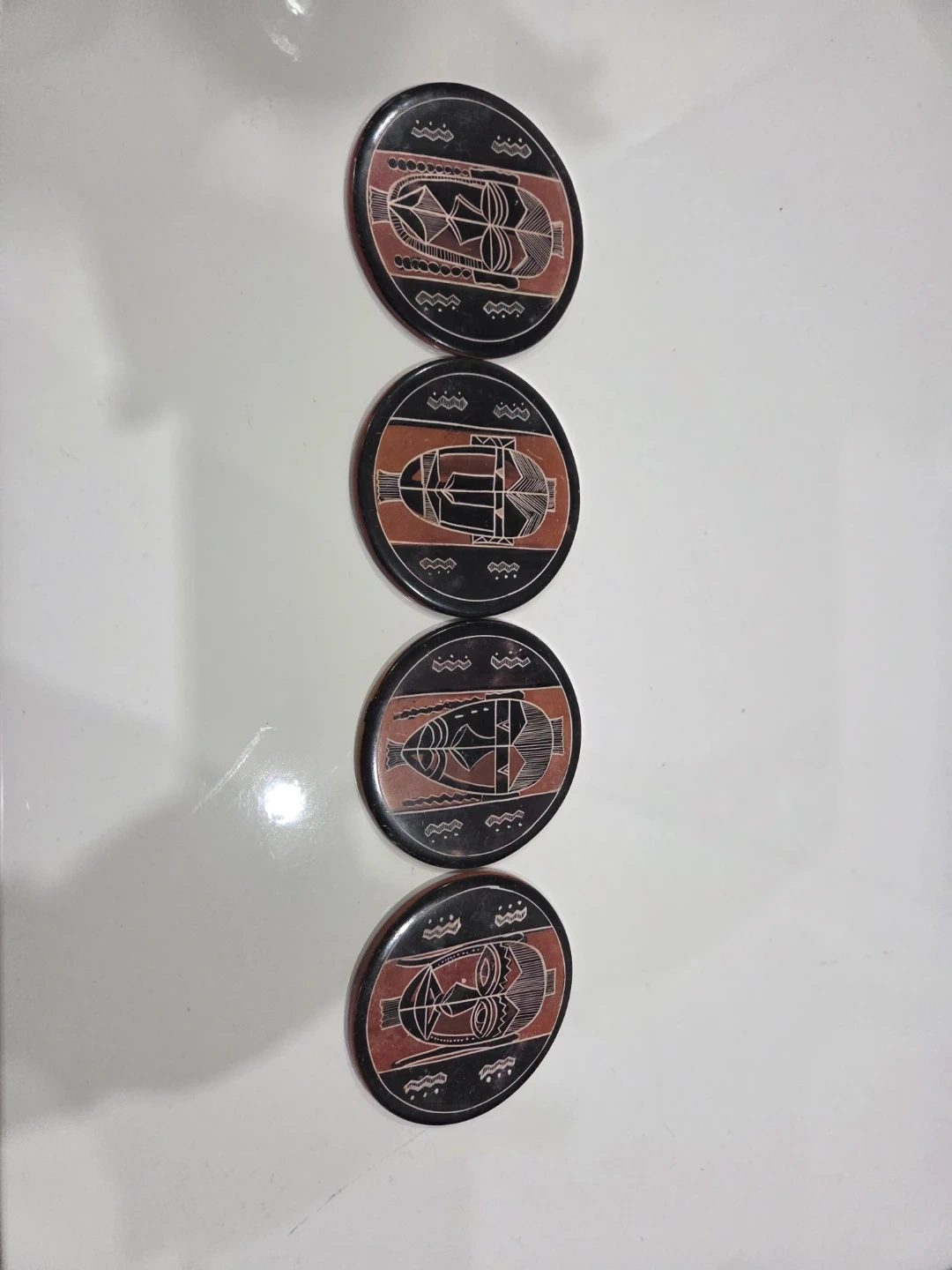 These coasters feature intricate black and rust-coloured designs with tribal motifs. They're made from a durable material, likely stone or a heavy resin. Each coaster has a unique pattern, adding an artisanal touch to your table. Perfect for protecting surfaces from drinks or as small decorative pieces!