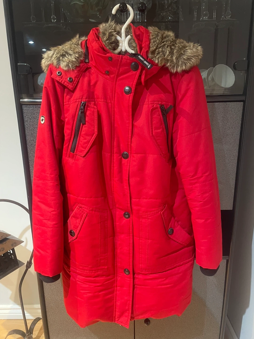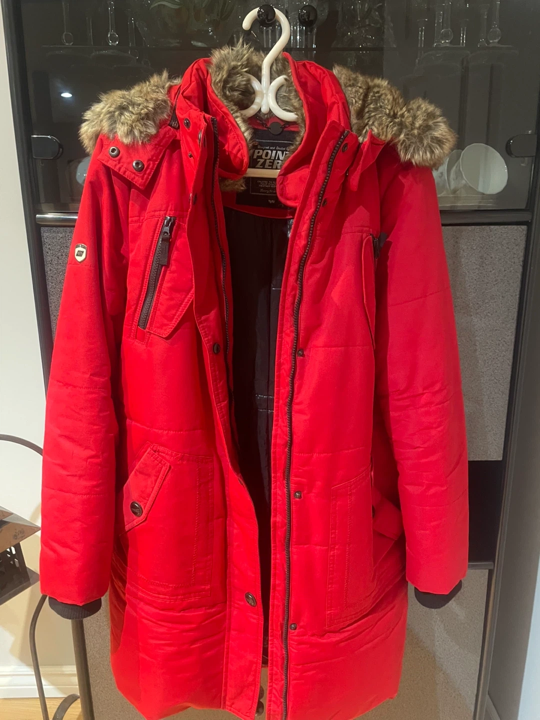 This warm winter parka from POINT ZERO comes in a vibrant red colour. It features a cozy faux fur-lined hood and multiple zippered pockets for practicality. It's designed for colder weather, offering both style and function.