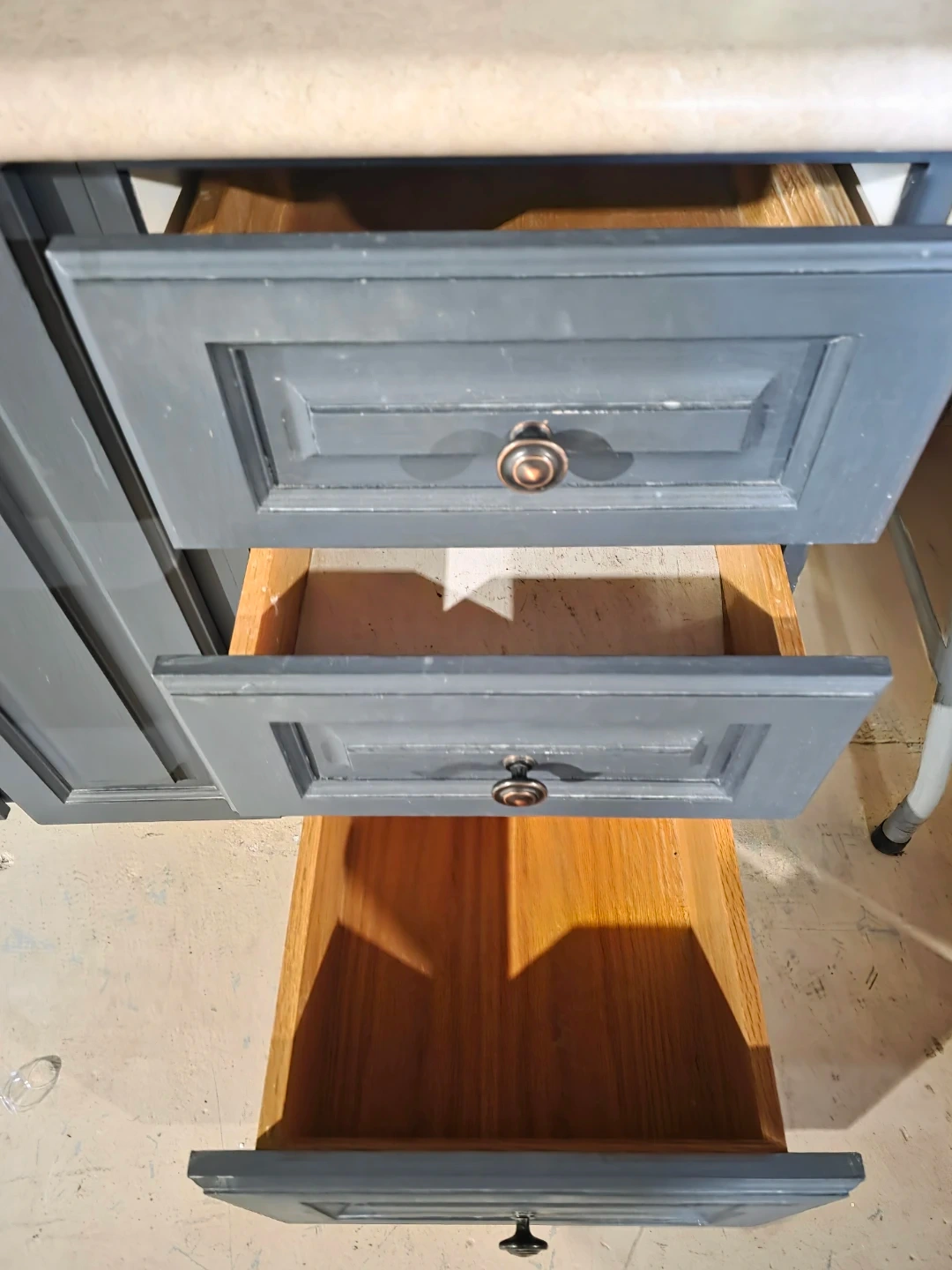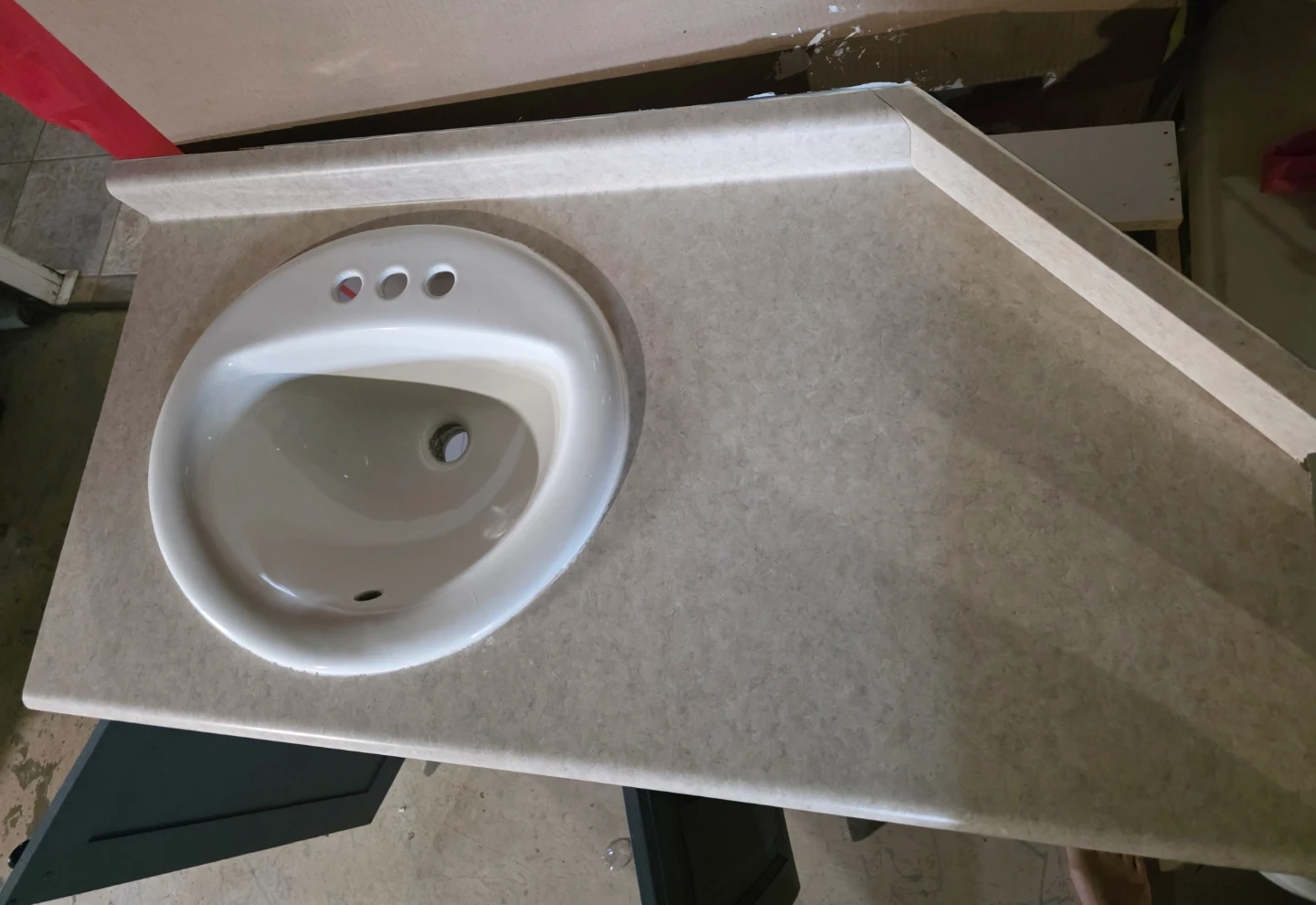 A white porcelain sink is mounted on a speckled countertop. The vanity base is dark grey with three drawers and two cabinet doors. It's a functional set for a bathroom reno. contact for measurements, open to offers!