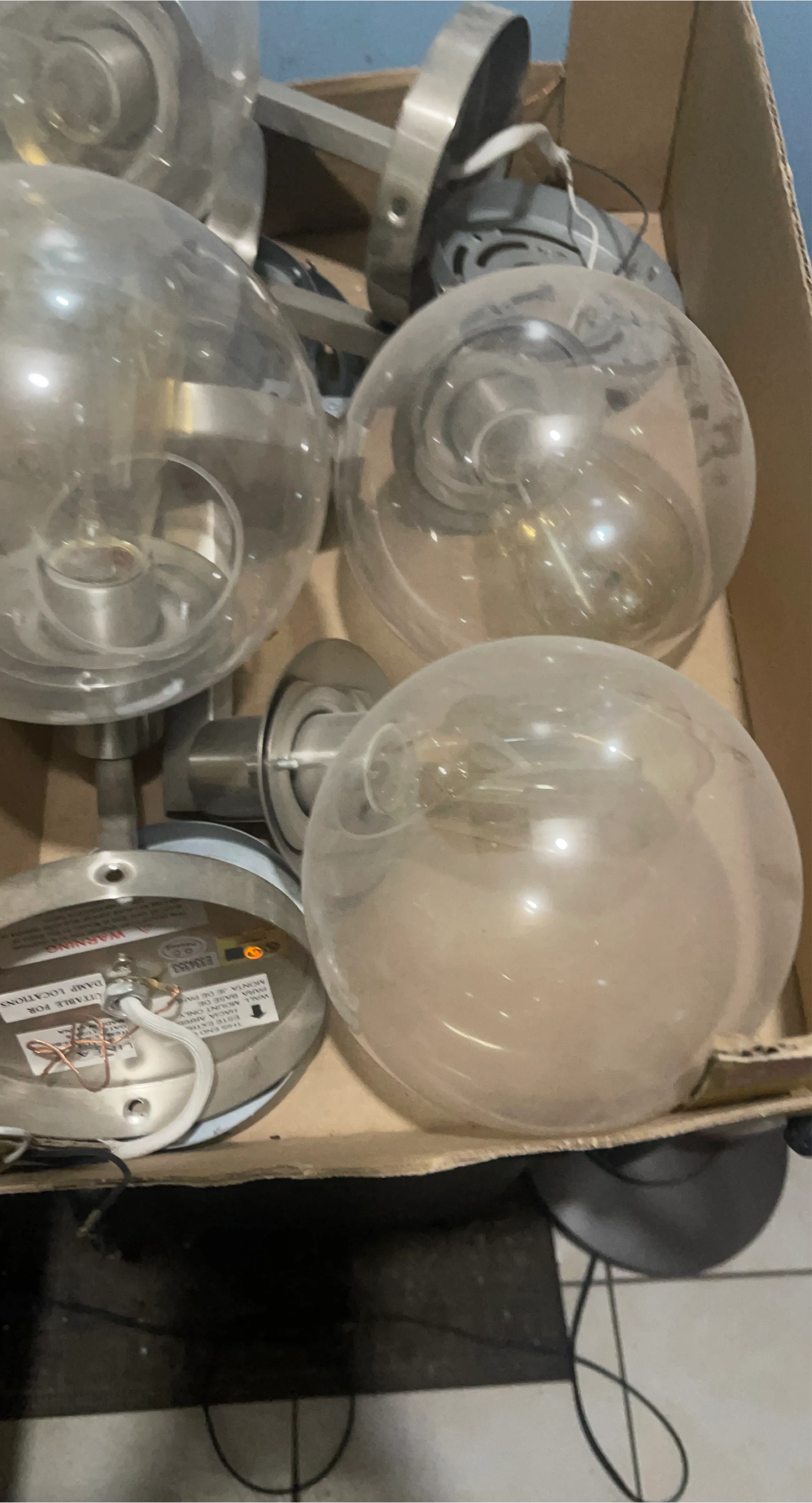 Set of three globe pendant light fixtures. Each features a clear glass shade and brushed nickel hardware. These fixtures are designed for indoor use. Includes mounting hardware and instructions.