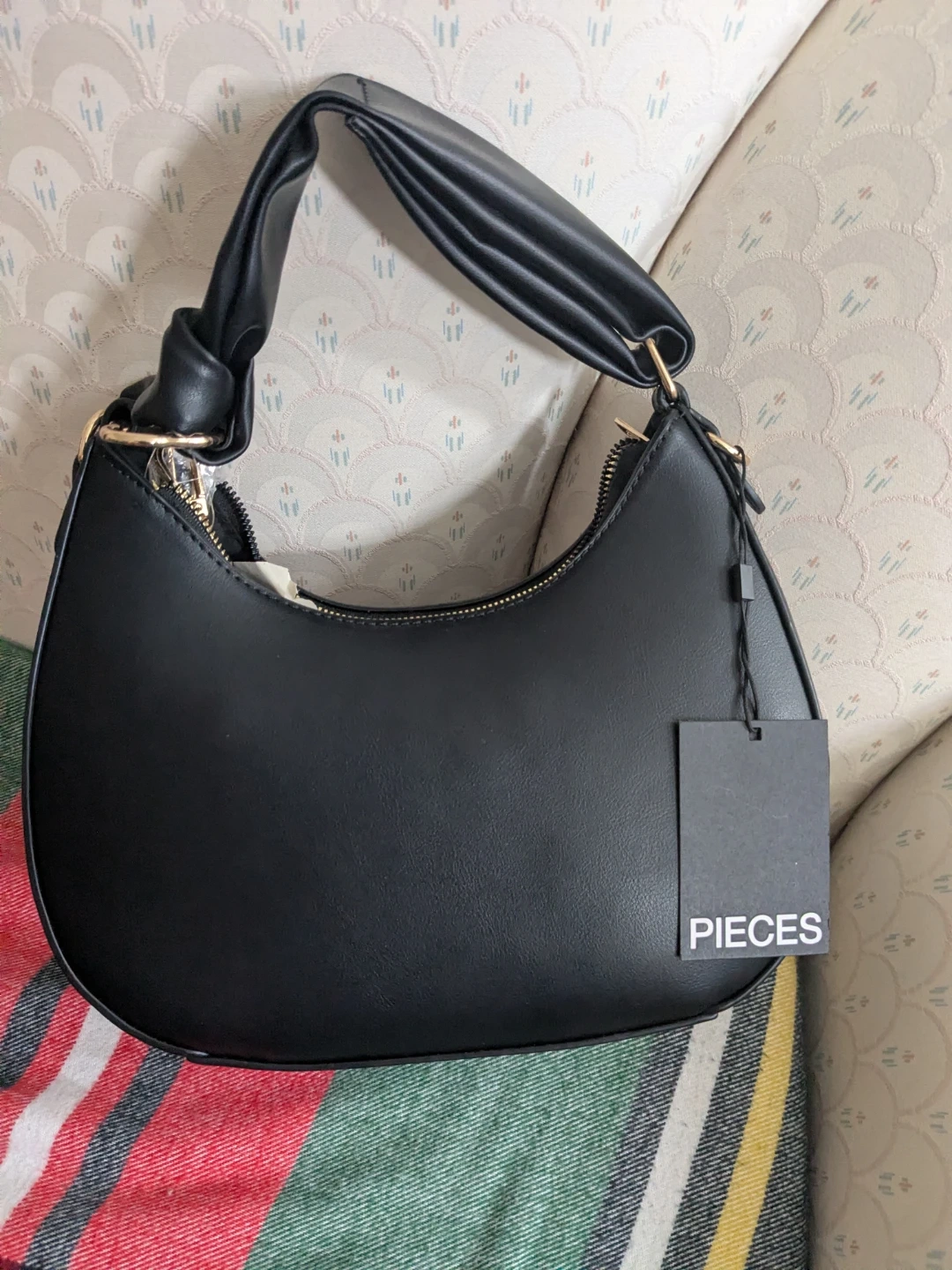 This is a black shoulder bag from PIECES. It's made of faux leather and features a zip closure. The bag has a sleek, modern design perfect for everyday use.
