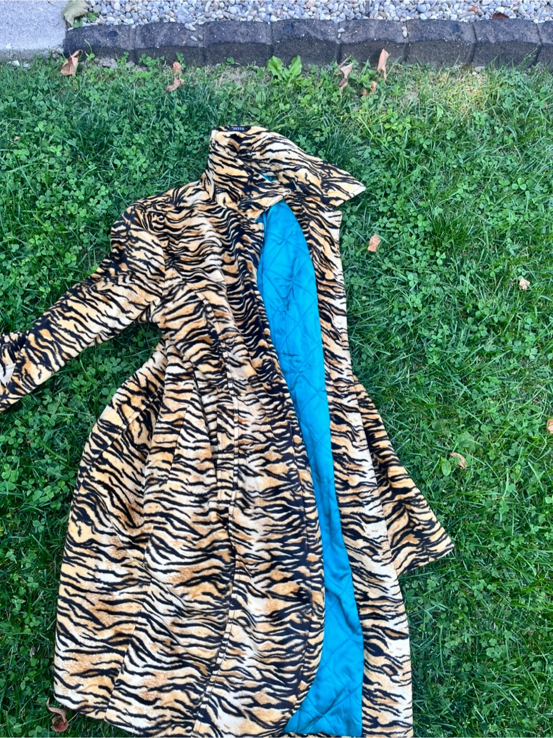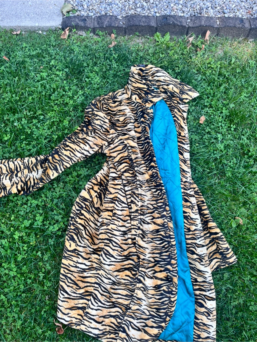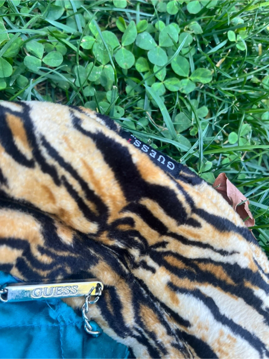 Selling a Guess coat with a unique tiger print! It has a bright blue lining that adds a fun pop of colour. Perfect for making a statement!