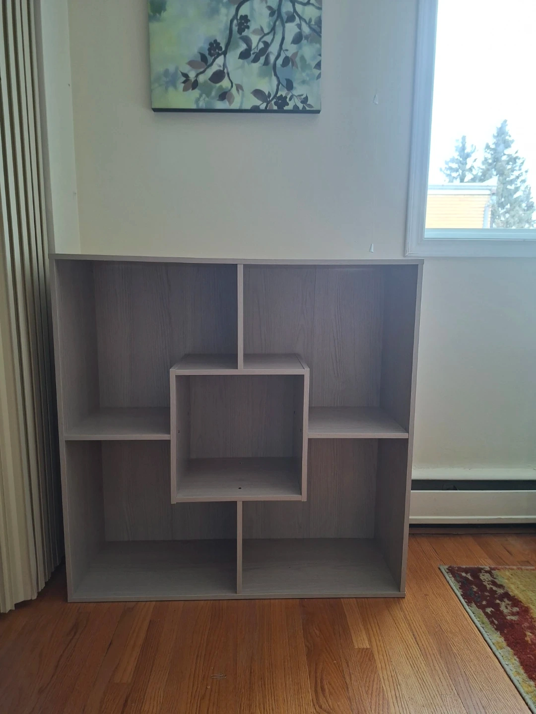This shelf unit features a modern stylish wood-grain finish and a unique cube in the centre. It's great for storing books or displaying decor! The approximate dimensions are 35.5" length x 11.5" deep/width x 35.5" high.