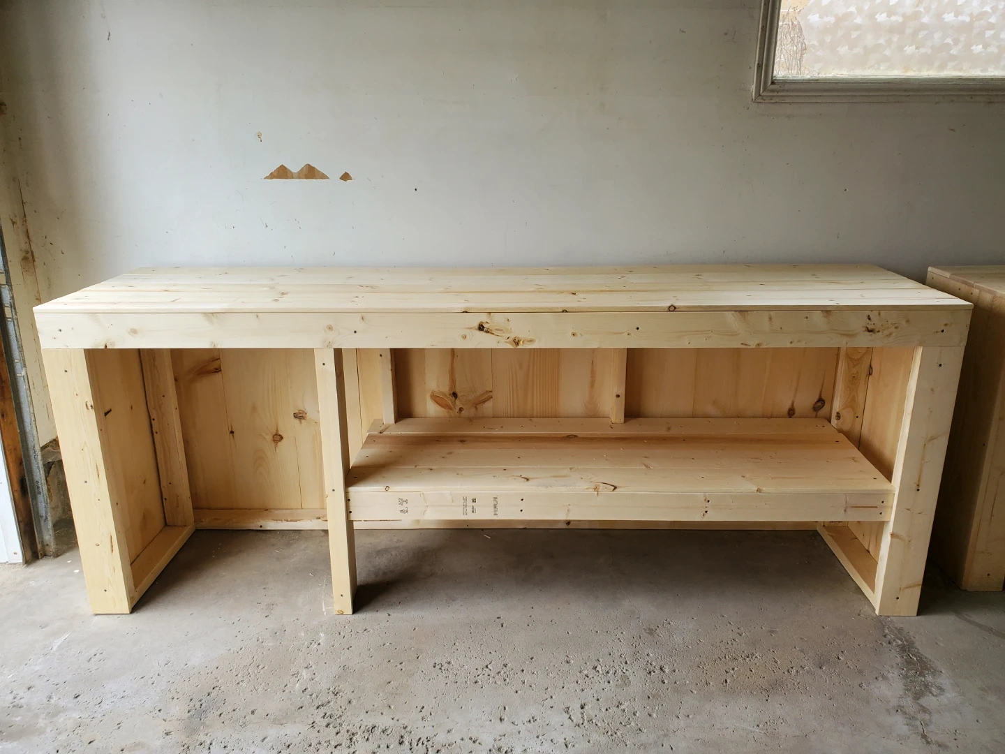 Solid wood workbench, perfect for a garage or workshop. It's got a sturdy construction with a lower shelf for extra storage. This workbench is ready for your projects!