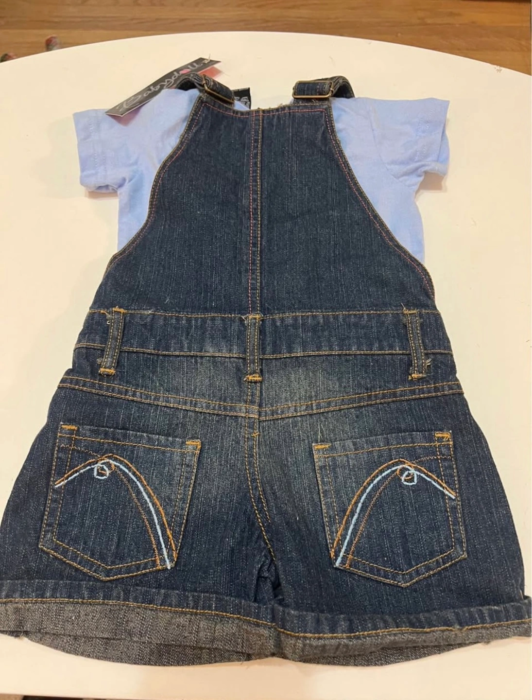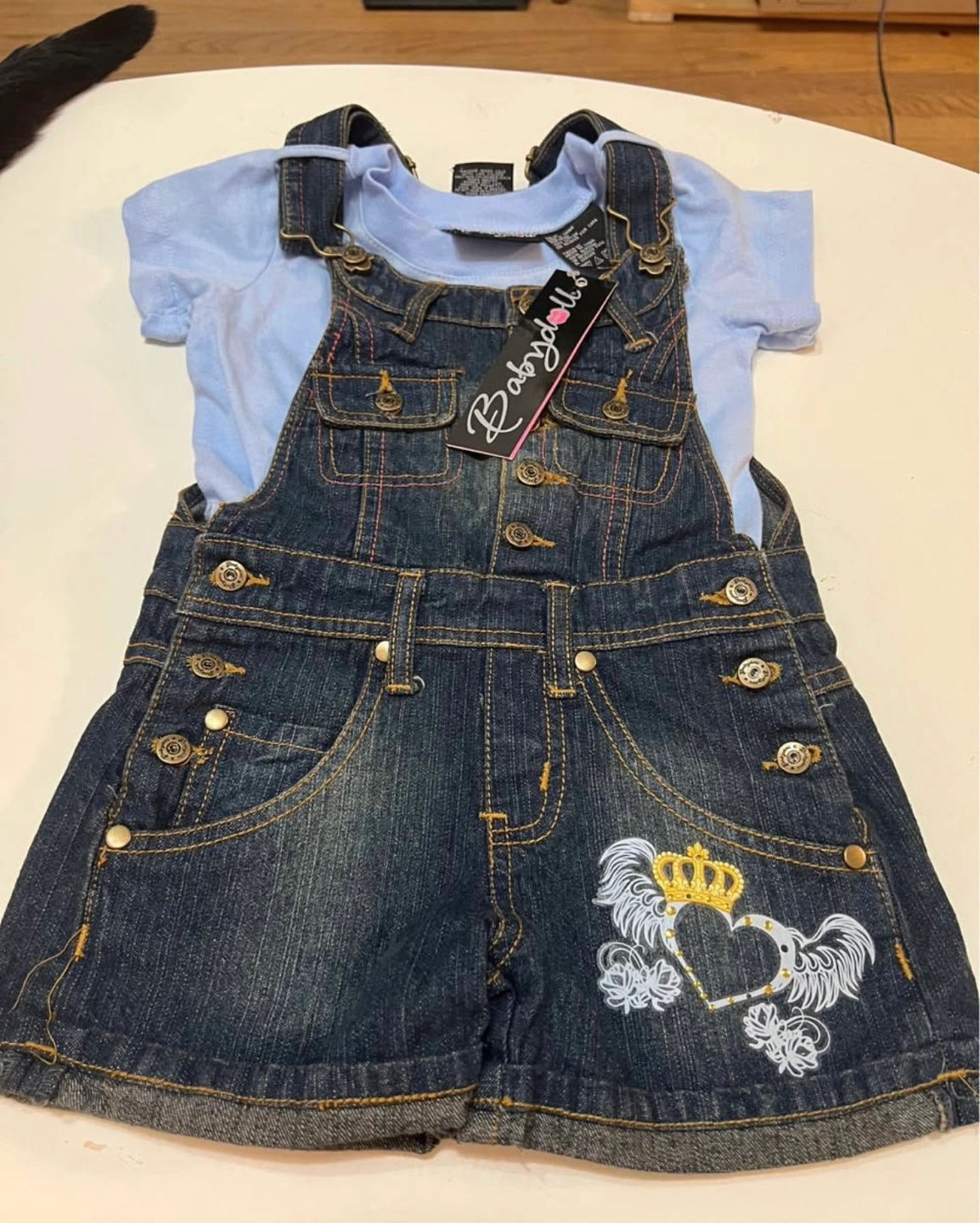 Adorable Babydollz denim overall set. Includes a light blue t-shirt. Size 4T. 100% cotton.
