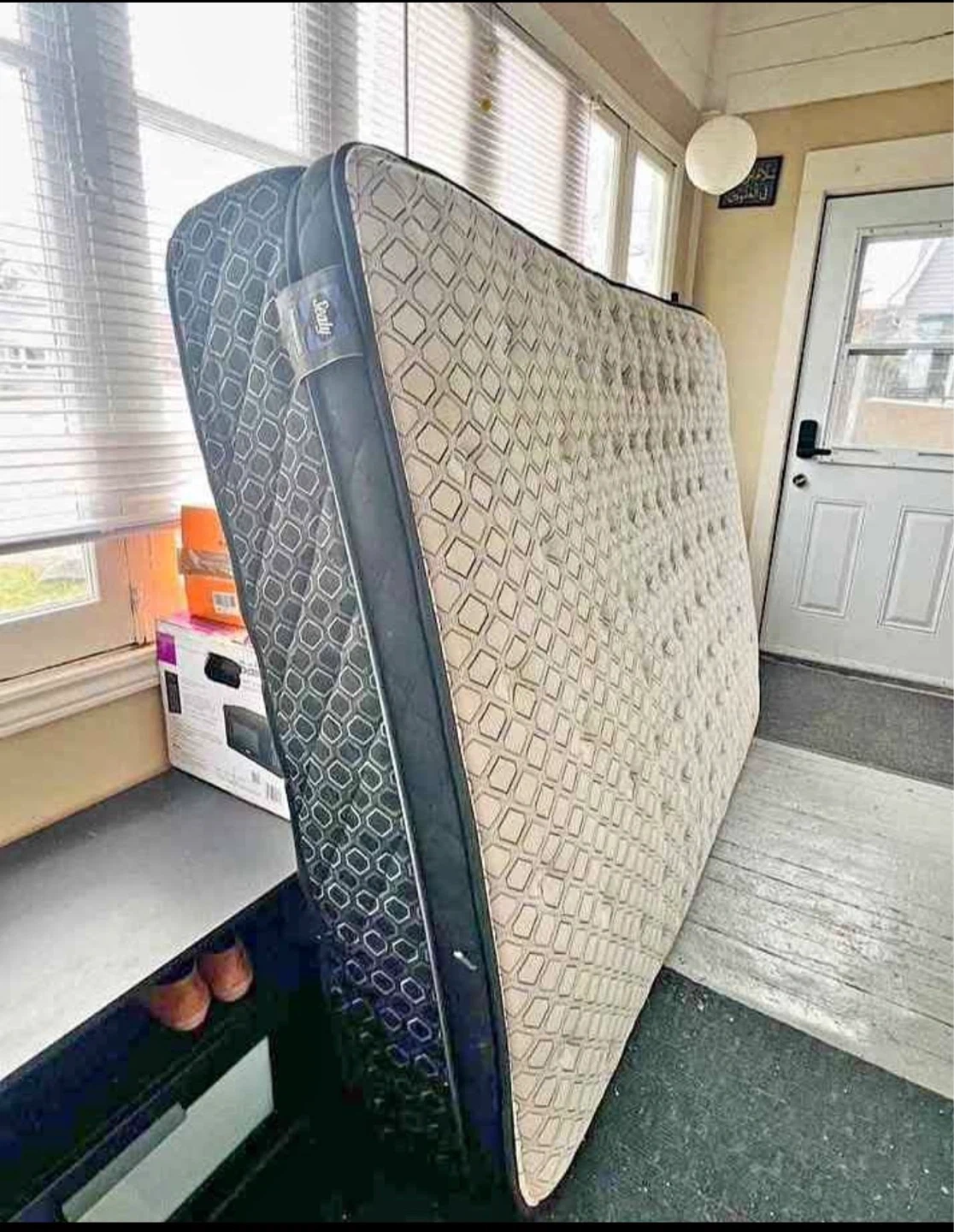 A Sealy king size mattress. It has a quilted top with a patterned side. Suitable for a king bed frame. Used for 2 months. Cleaned. Protective cover around it. Pickup only.