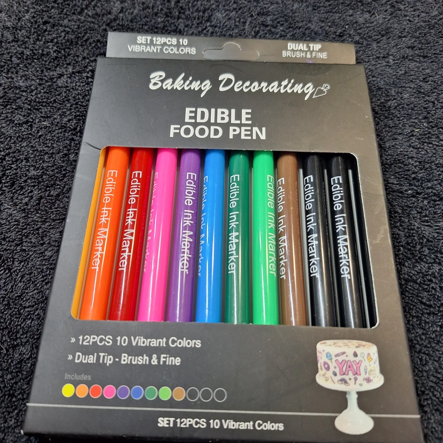Set of 10 edible ink markers with dual tips, brush and fine. Each pen is 19g. Imported into Canada by Exclusive Brands. Best Before 2027/SE/23.