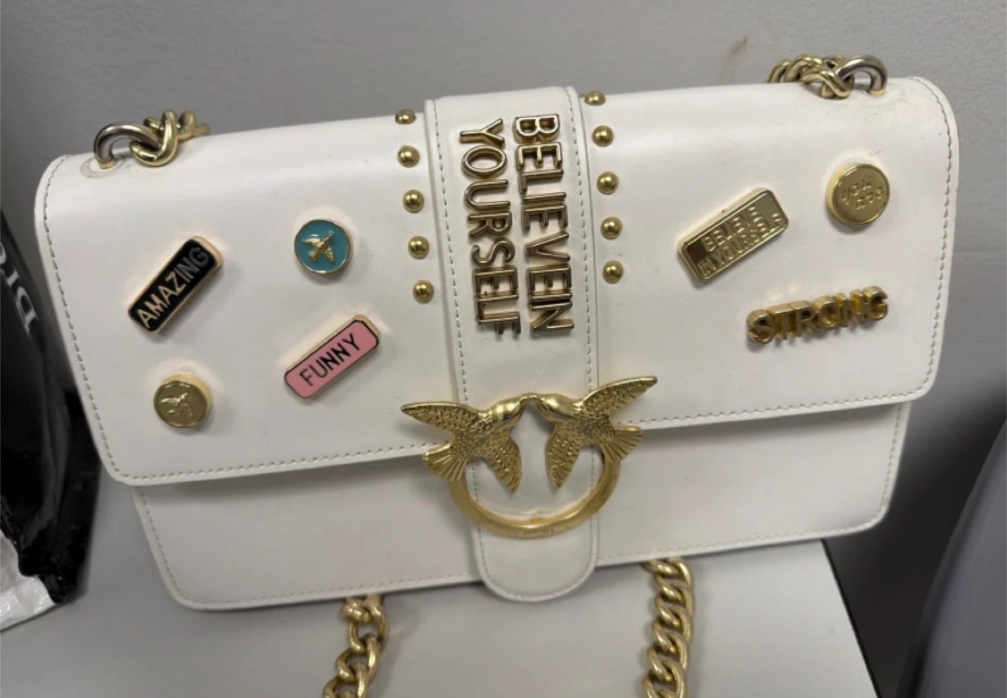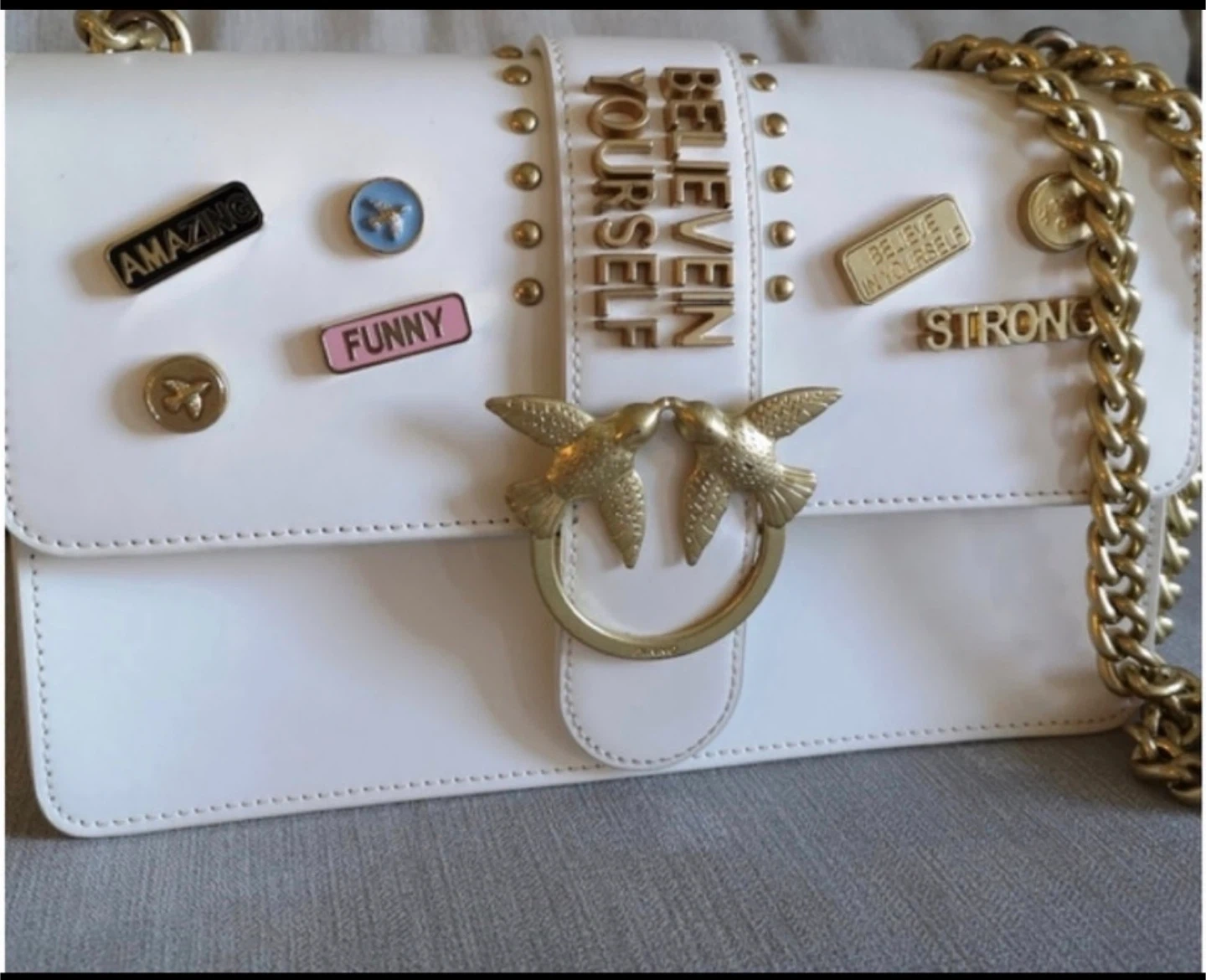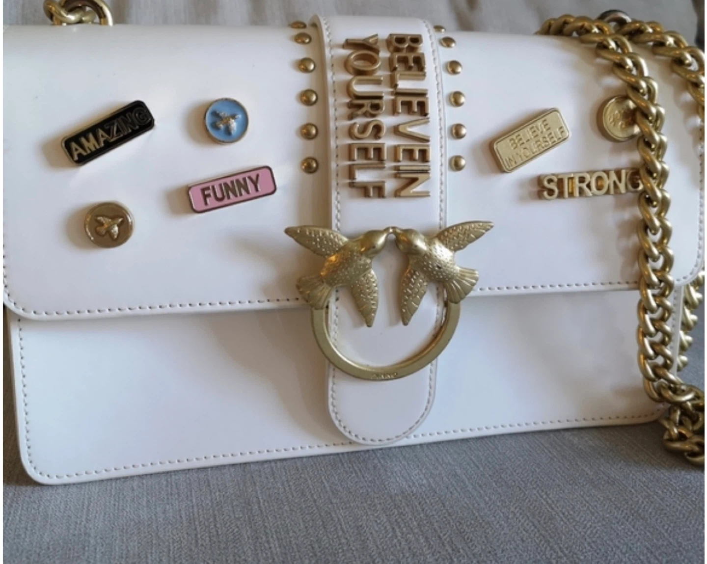 Chic white leather shoulder bag from Pinko. It features a gold-tone chain strap and decorative pins with inspirational words like 'Amazing', 'Funny', 'Strong', and 'Believe in Yourself'. The interior is lined and includes a zippered pocket.