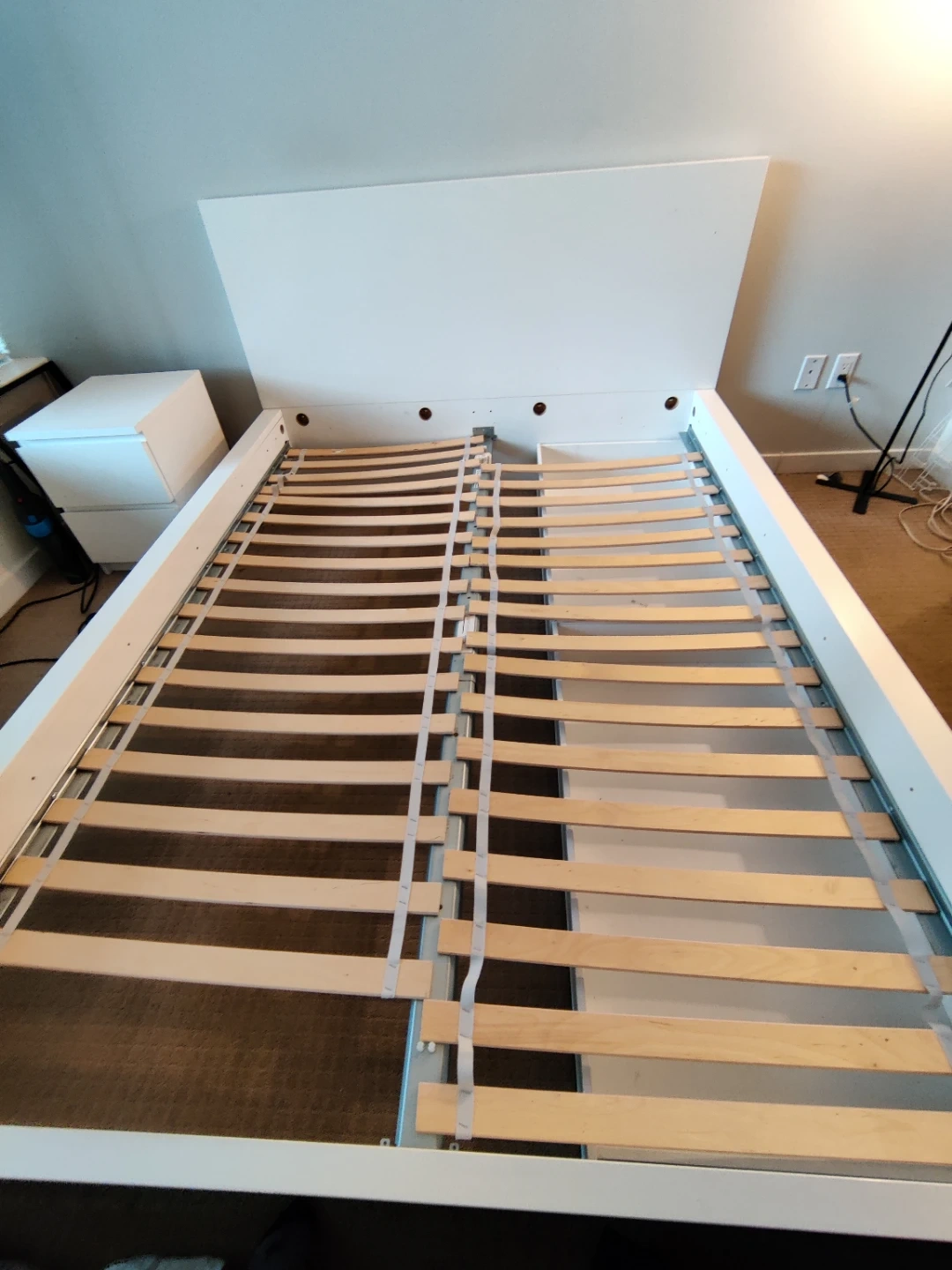 This is a white queen-size bed frame with a headboard and integrated storage drawers. It includes a slatted base for mattress support. The frame is made of wood composite and features a modern design.