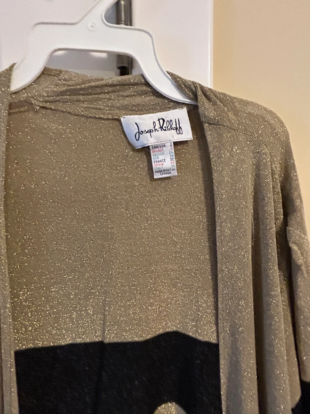 This Joseph Ribkoff cardigan features a shimmering gold glitter fabric with bold black stripes. It's a size 2, perfect for adding a touch of sparkle to any outfit. Crafted with a blend of materials for comfort and style.