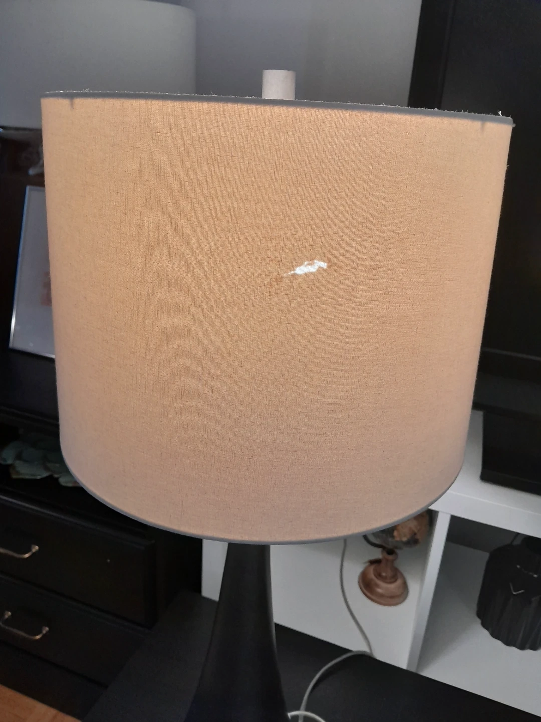 Vintage lampshades with some signs of wear. Both have lights working but one lamp switch is loose. It will light up as you plug in.