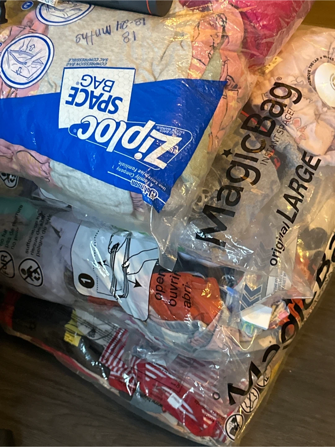 Lot of compression storage bags: one Ziploc brand and one Magic Bag brand. Includes boys and girls clothing ages 0-3 months to 3T