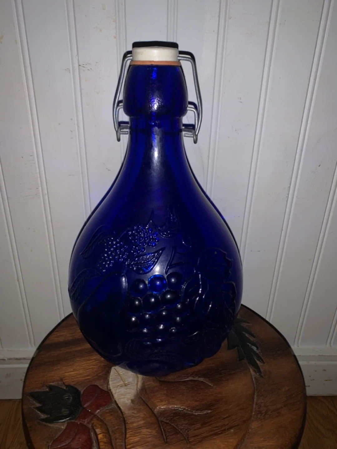 This decorative cobalt blue glass bottle features embossed grape clusters and leaves. It has a swing-top lid with a wire closure and a ceramic stopper. It's perfect for storing or displaying beverages.