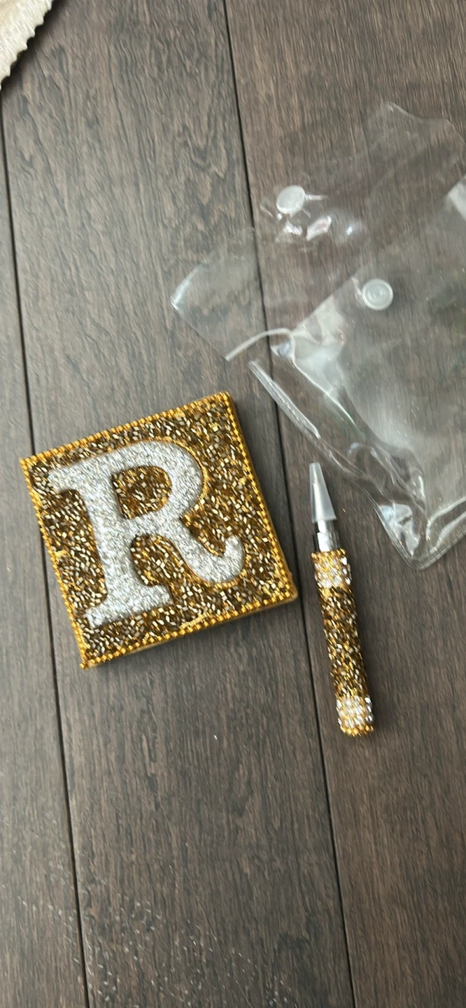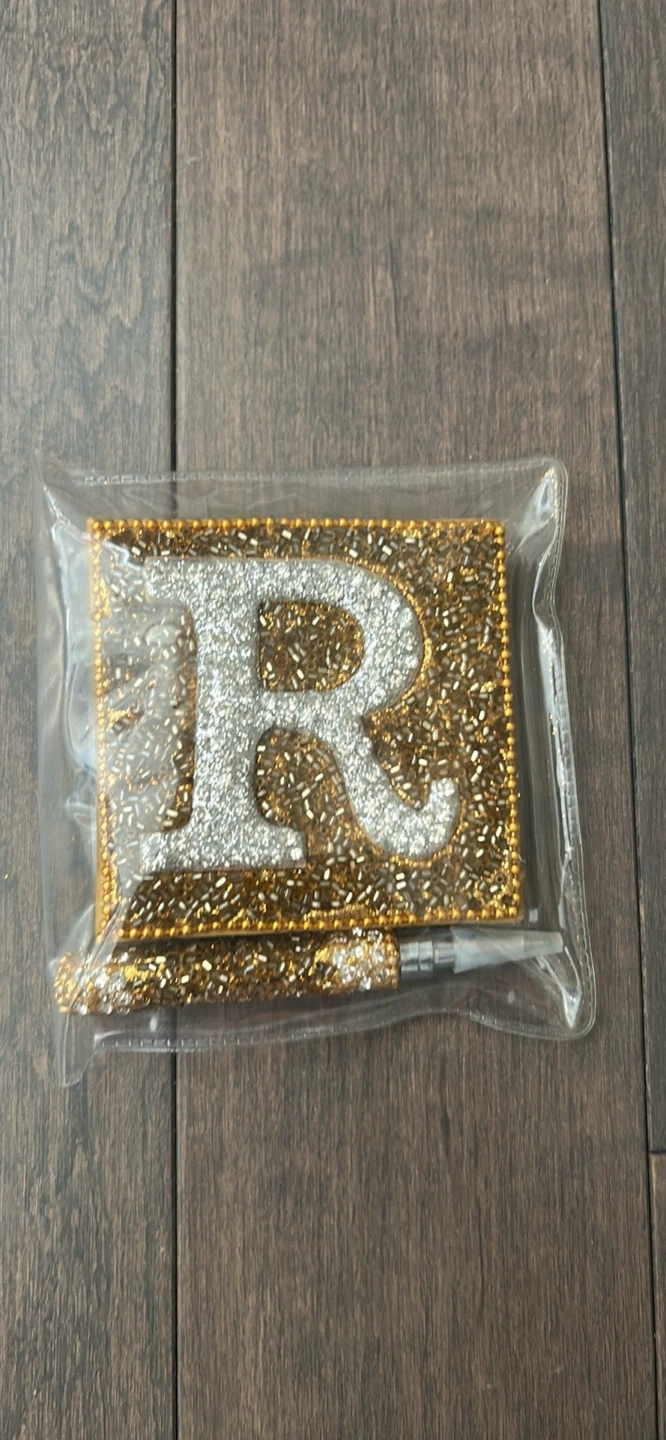 This dazzling set includes a square pen holder embellished with sparkling gold and silver crystals, featuring a large 'R' initial. It also comes with a matching crystal-encrusted pen. Both items are new and presented in their original packaging.
