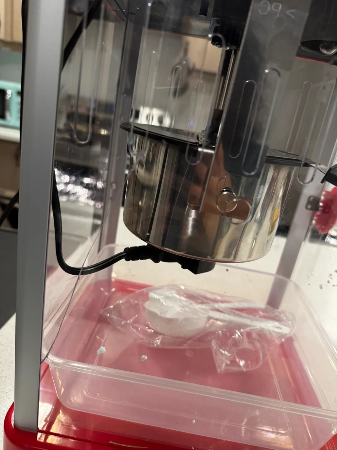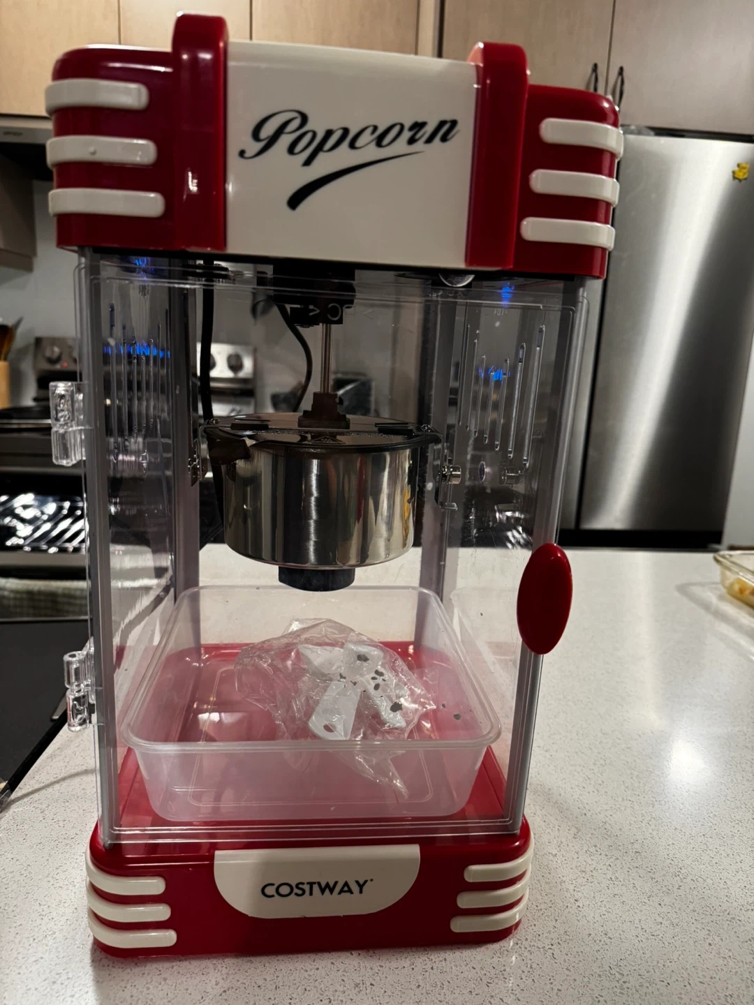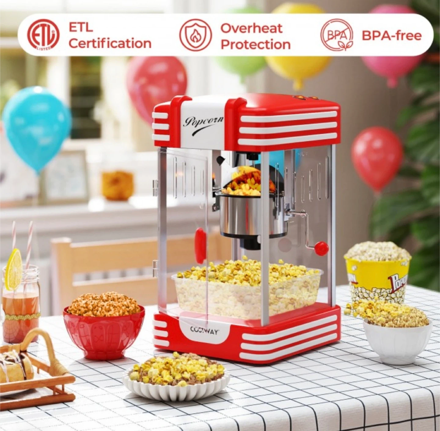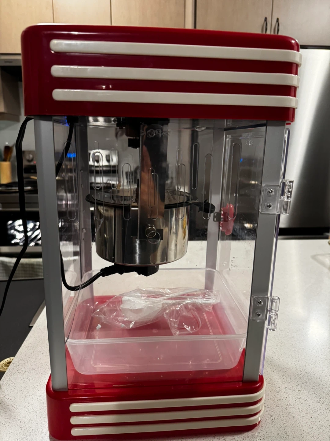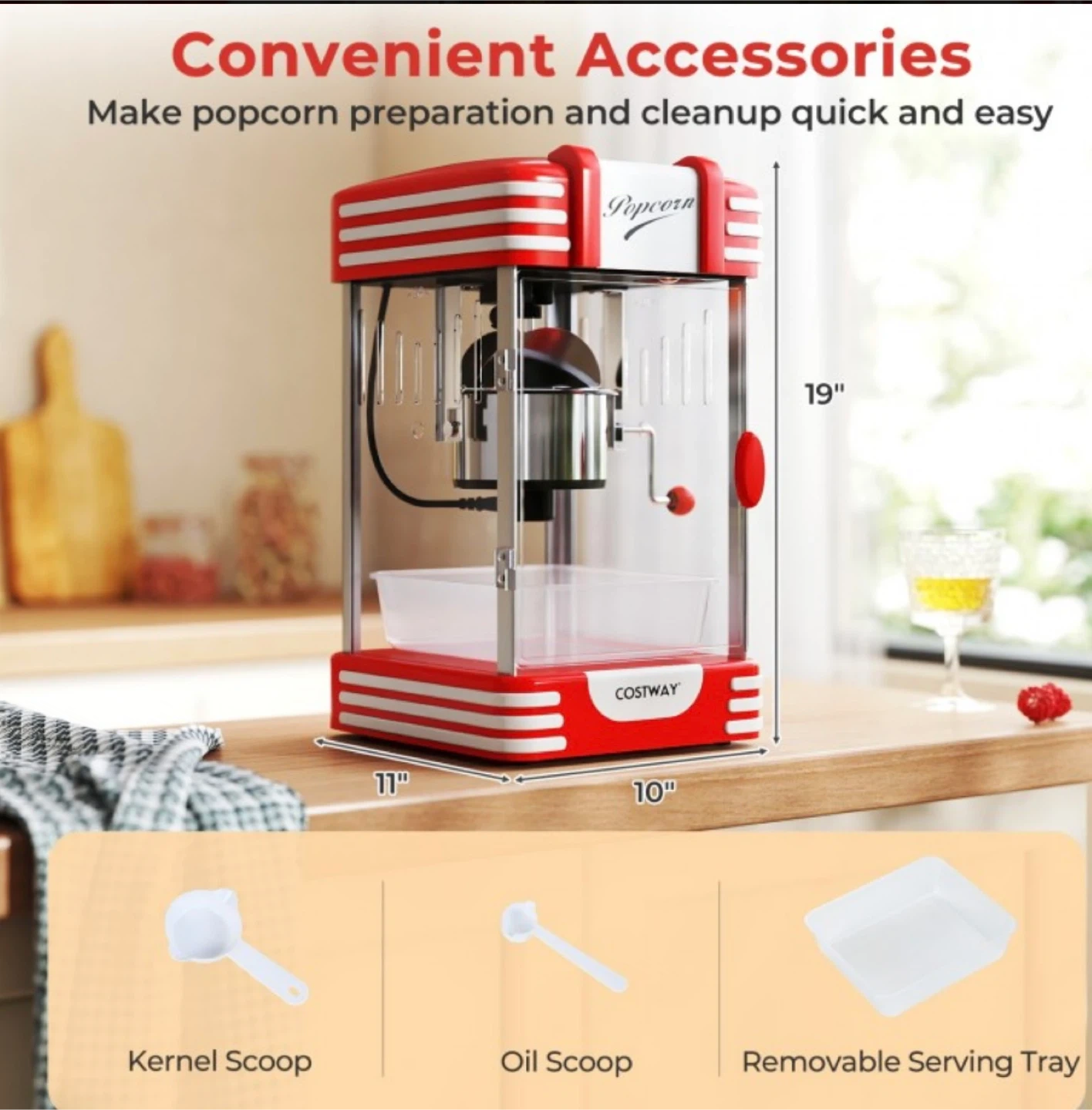 This is a red retro popcorn machine. It features a stainless steel popping pot. The machine has separate switches for the lamp and the heating element.