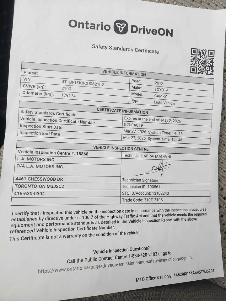 Certified Toyota Camry 2012 LE sedan, 4 cylinder Engine, with 179,684km. Superb Engine and Transmission, cooling & heating system working perfectly well, good suspensions, clean interior. Has some scratches on the side. Alloy wheels with all-season tires. Good for daily commute.