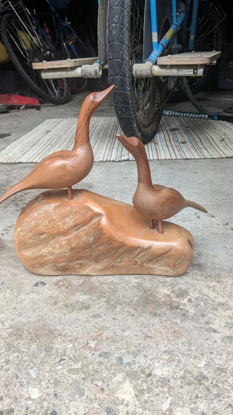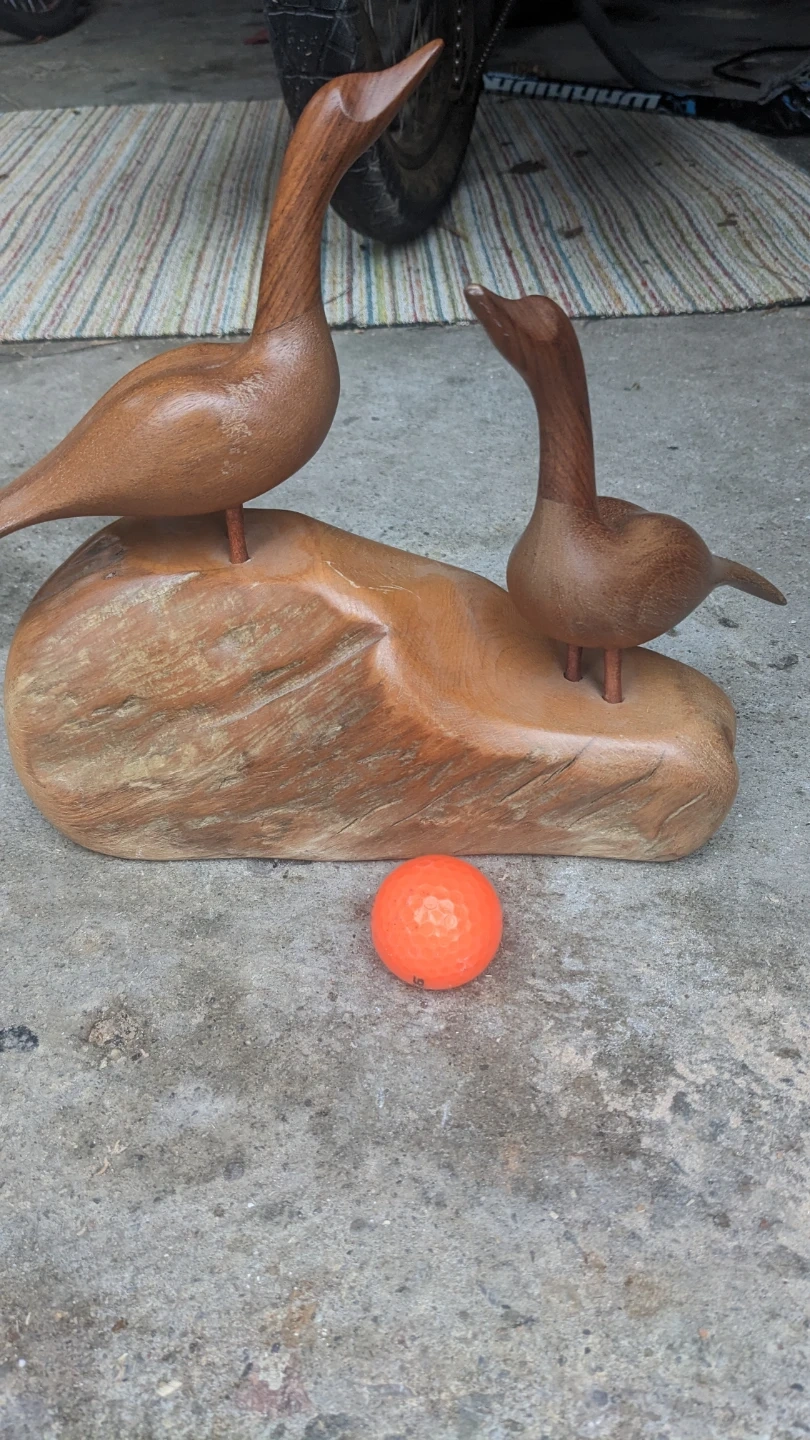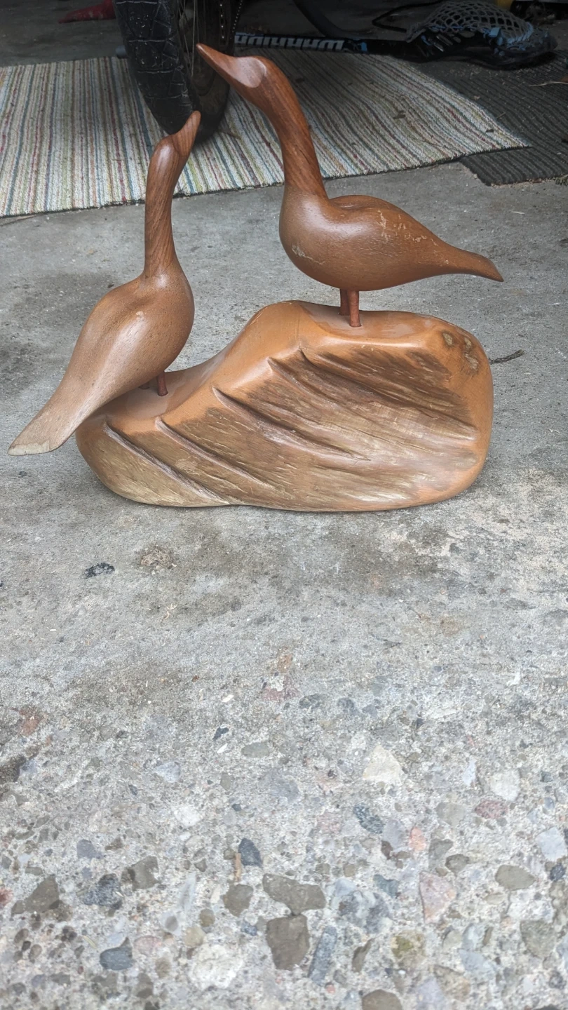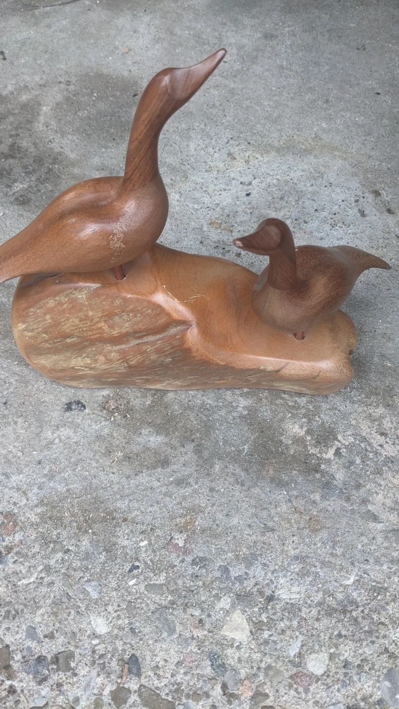 This is a lovely wooden sculpture of two ducks on a natural base. Hand-carved by J. Grantins from Lake St. Peter, Ont. Canada. It's a beautiful decorative piece for any home.