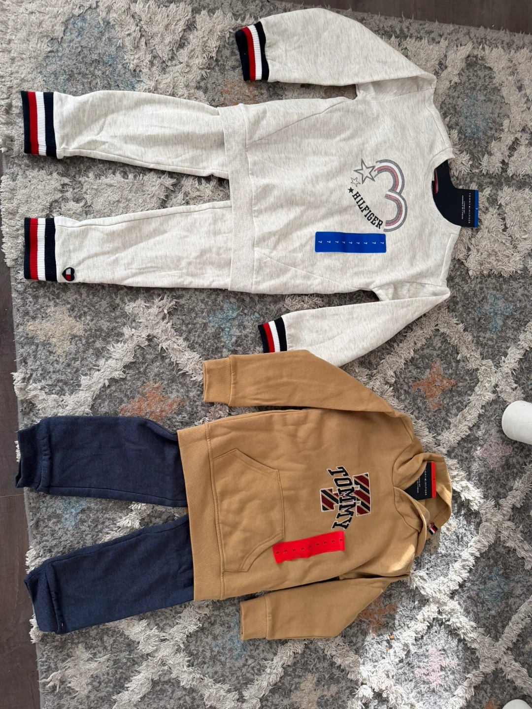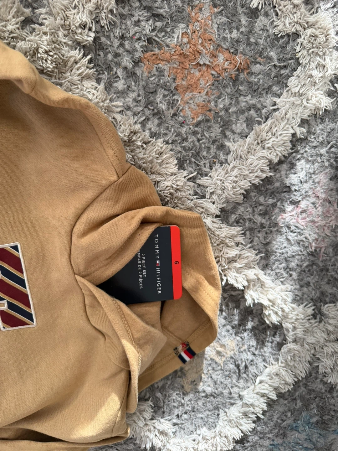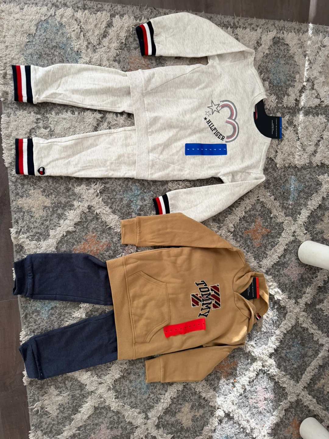Two Tommy Hilfiger outfits for kids. Includes a light grey crewneck sweatshirt with matching pants, and a tan hoodie with dark blue pants. Both are size 6. Perfect for casual wear!