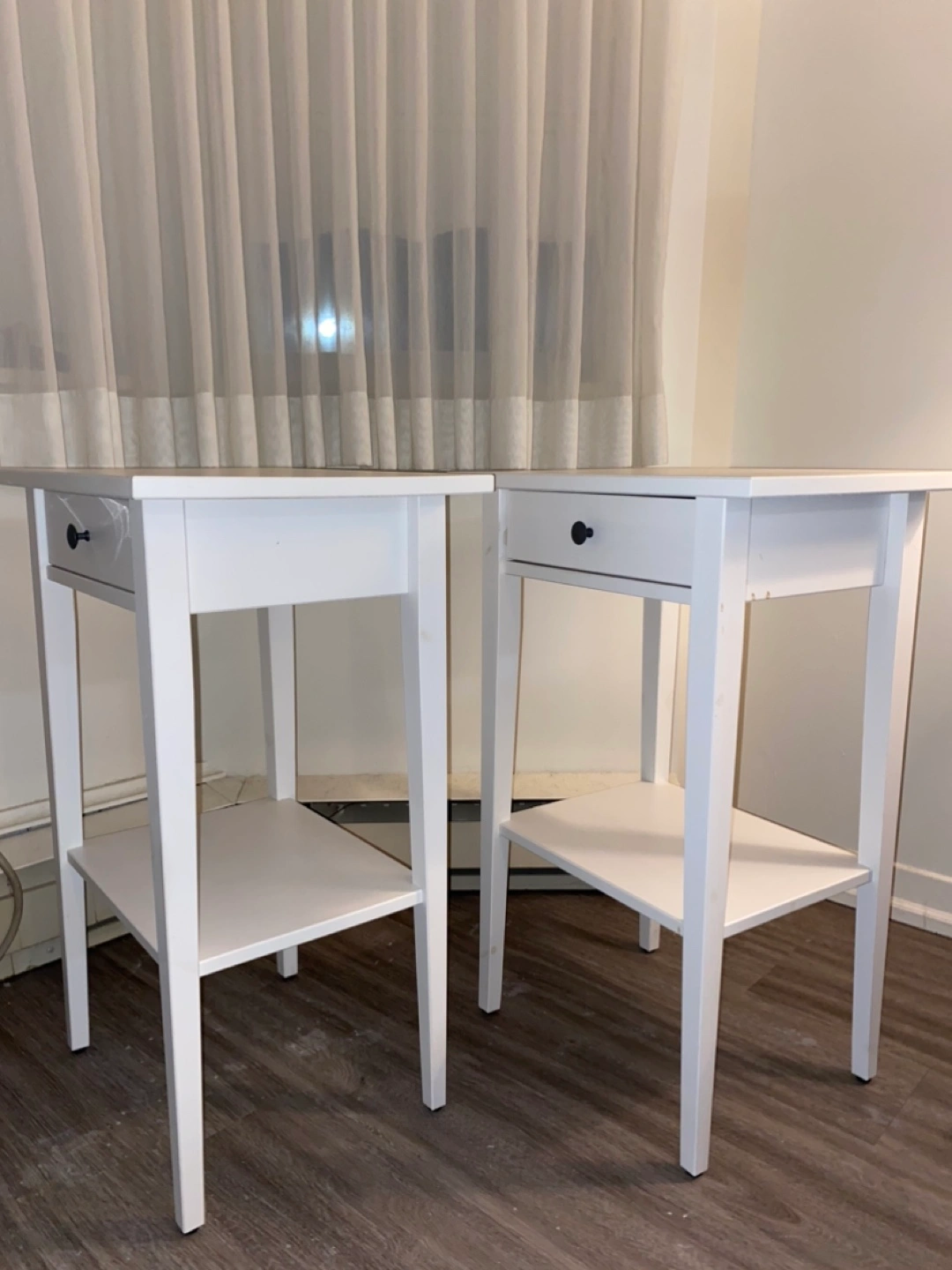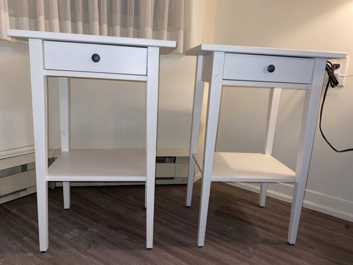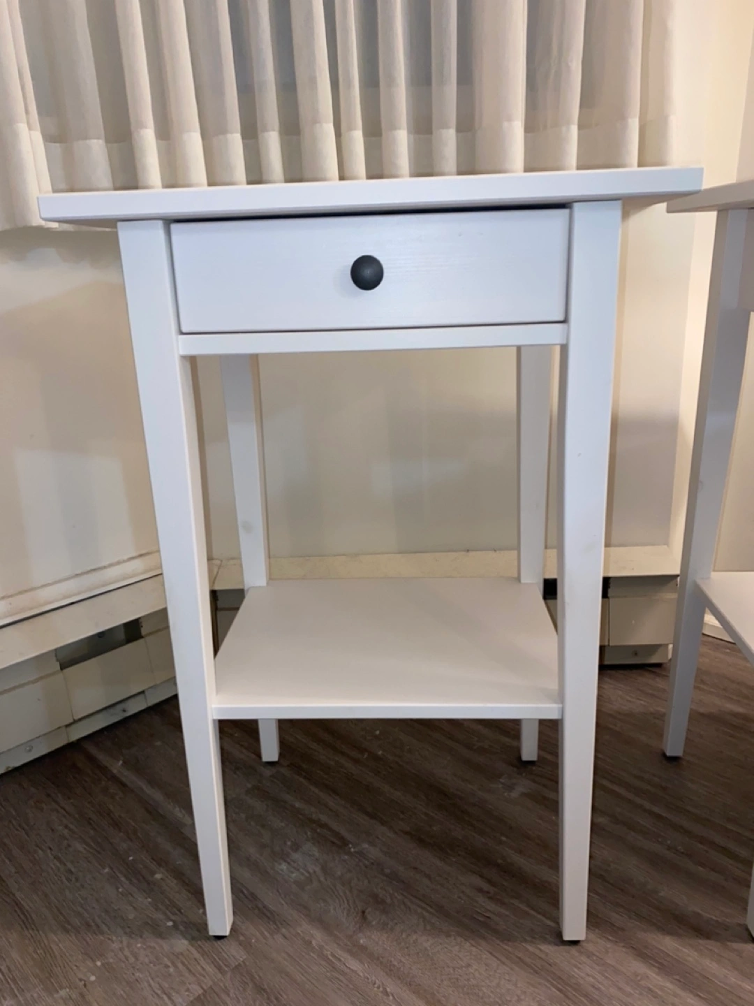 Two white Hemnes nightstands/side tables from IKEA. Simple design. Classic items. One drawer and a lower shelf. Perfect condition. Used very little and didn’t own for long.