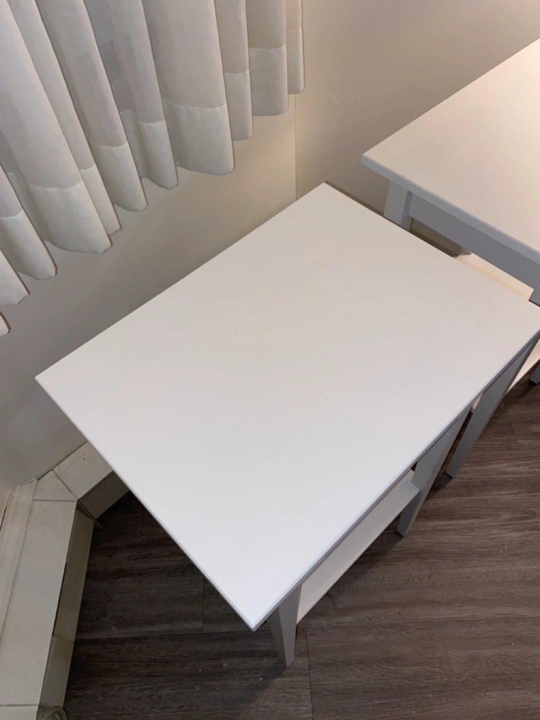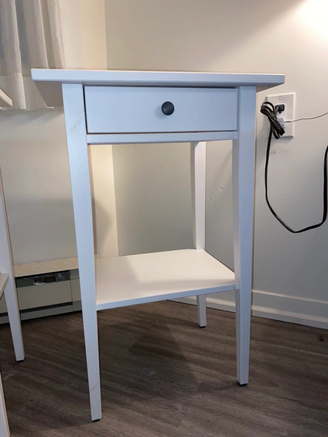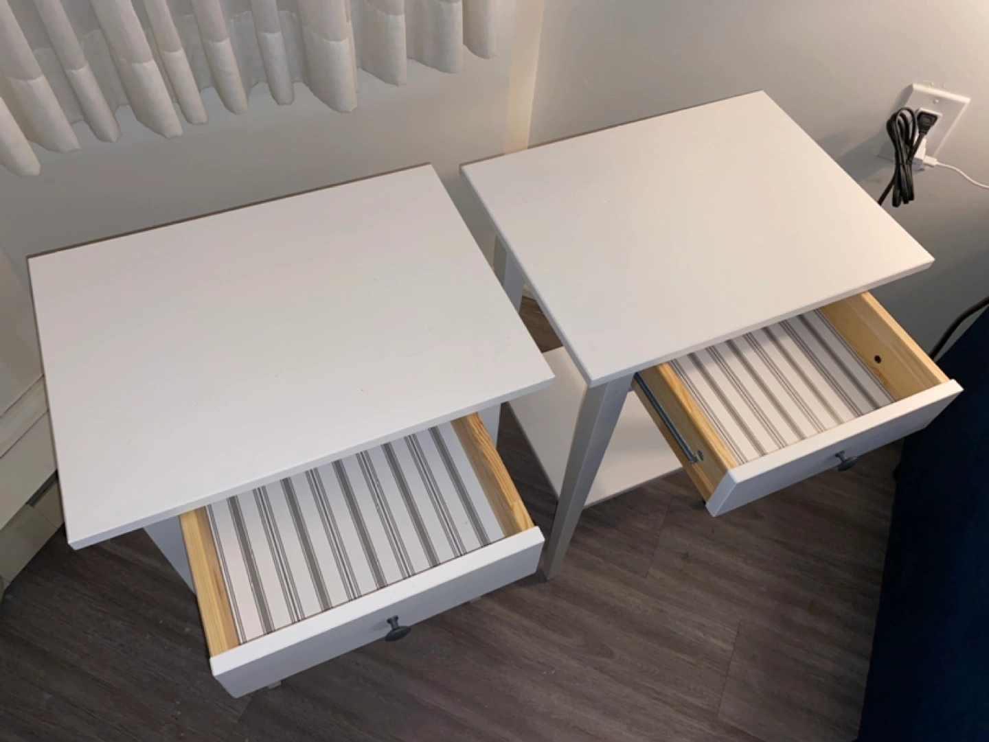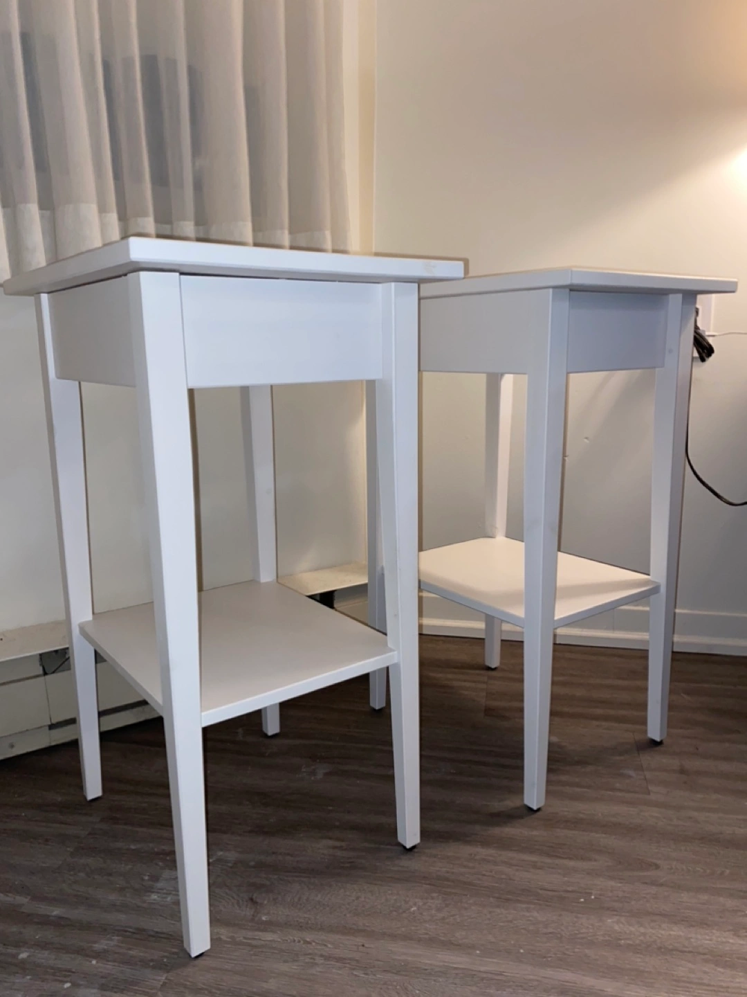 Two white Hemnes nightstands/side tables from IKEA. Simple design. Classic items. One drawer and a lower shelf. Perfect condition. Used very little and didn’t own for long.
