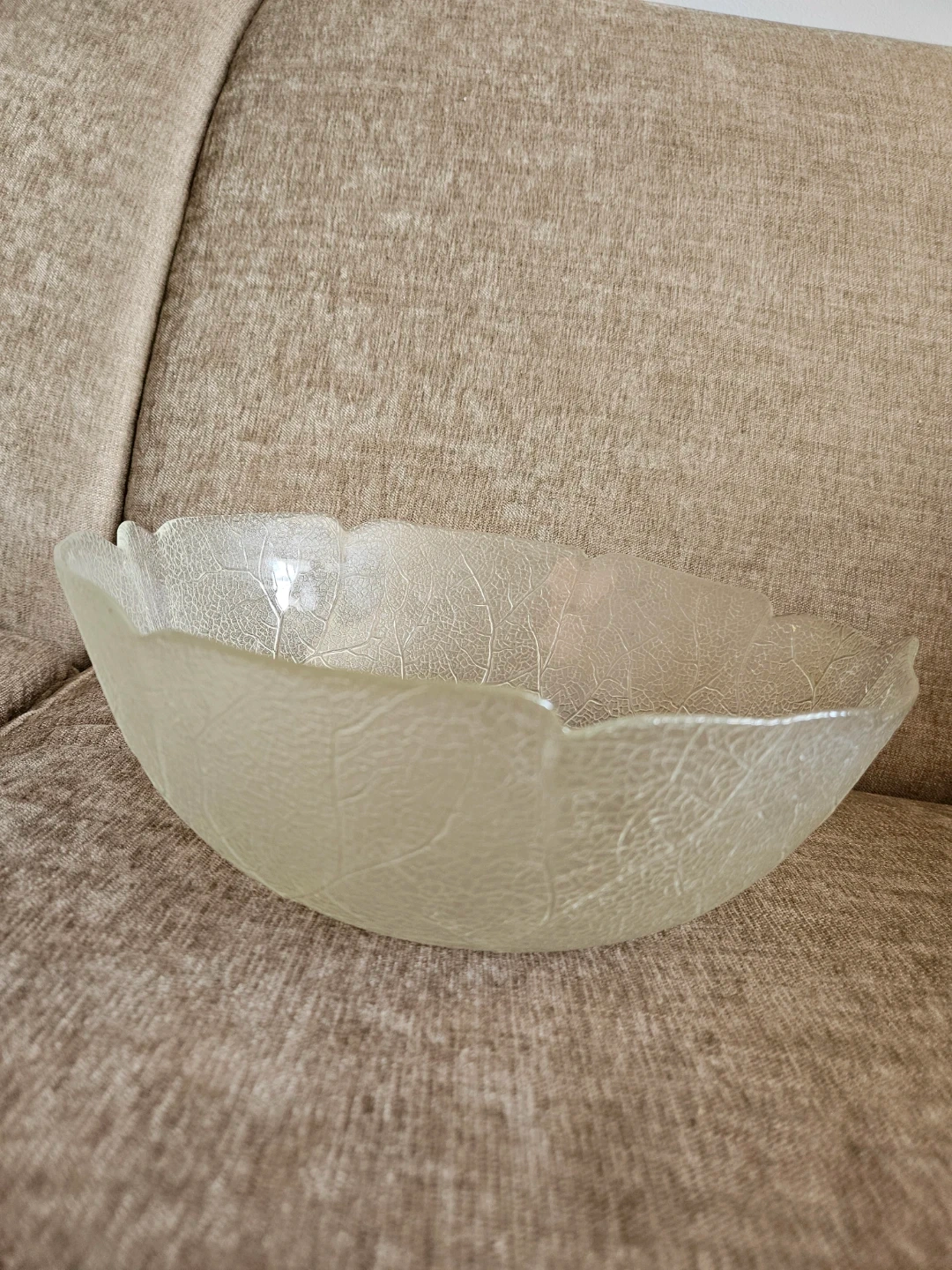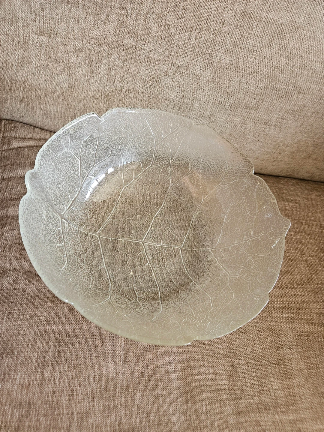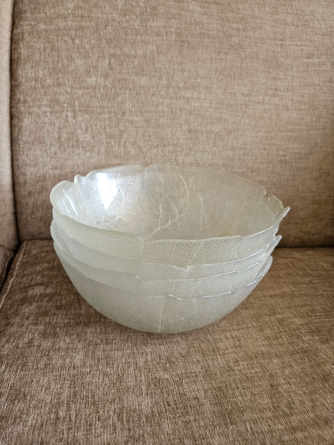 (Eng. Below) Voici un ensemble de quatre bols en verre transparent en forme de feuille. Le verre présente une texture dépolie et de fines nervures. Ils sont parfaits pour servir des amuse-gueules ou des accompagnements lors de réceptions. Dimensions/Size approximatives : 12,5 x 28 cm (5 x 11 pouces) This is a set of four clear glass bowls designed in a leaf shape. The glass has a frosted texture with detailed vein patterns. They're perfect for serving snacks or side dishes at gatherings.