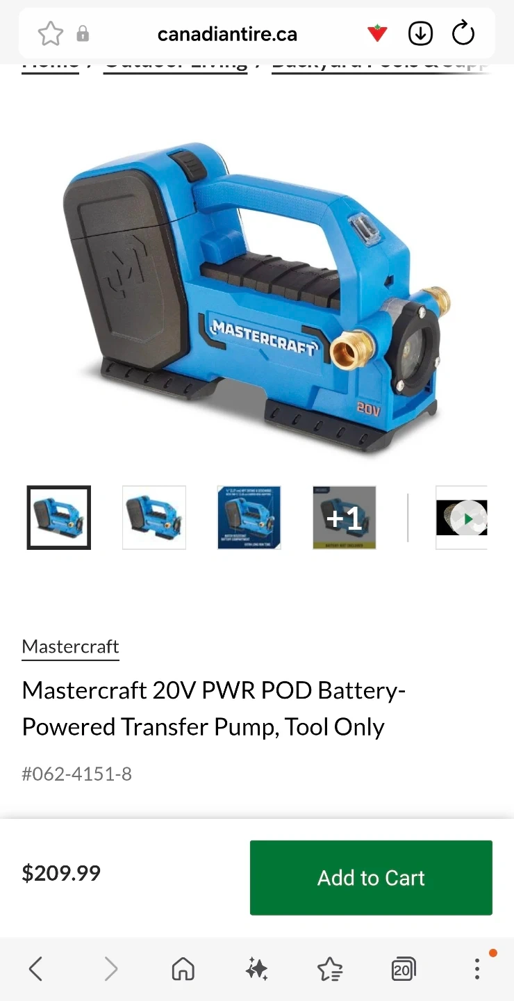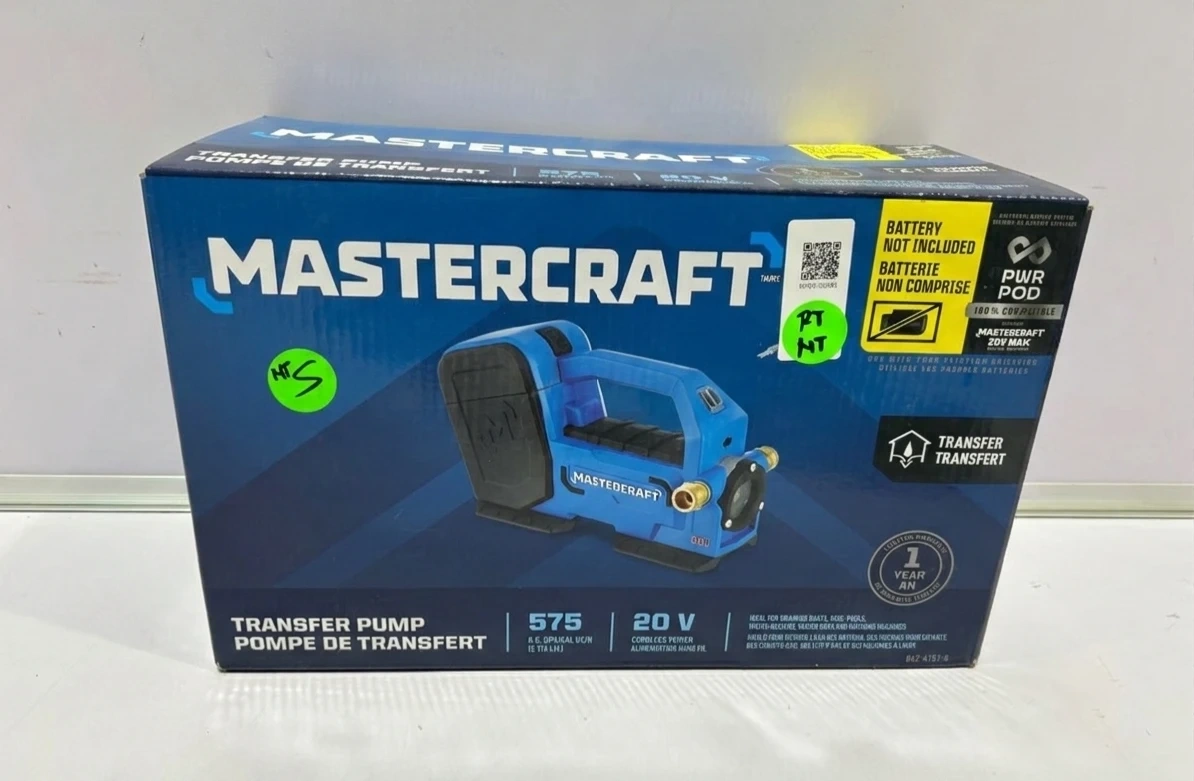 This is a Mastercraft 20V transfer pump. It's a battery-powered unit for convenient use. This pump is great for transferring fluids like gas or water safely and efficiently.