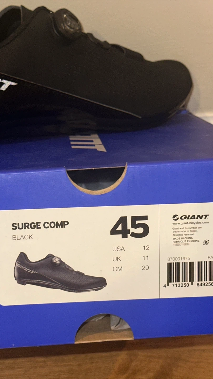 Selling a pair of Giant Surge Comp cycling shoes in black. They are a US size 12, UK size 11, or CM 29. Comes with the original box!