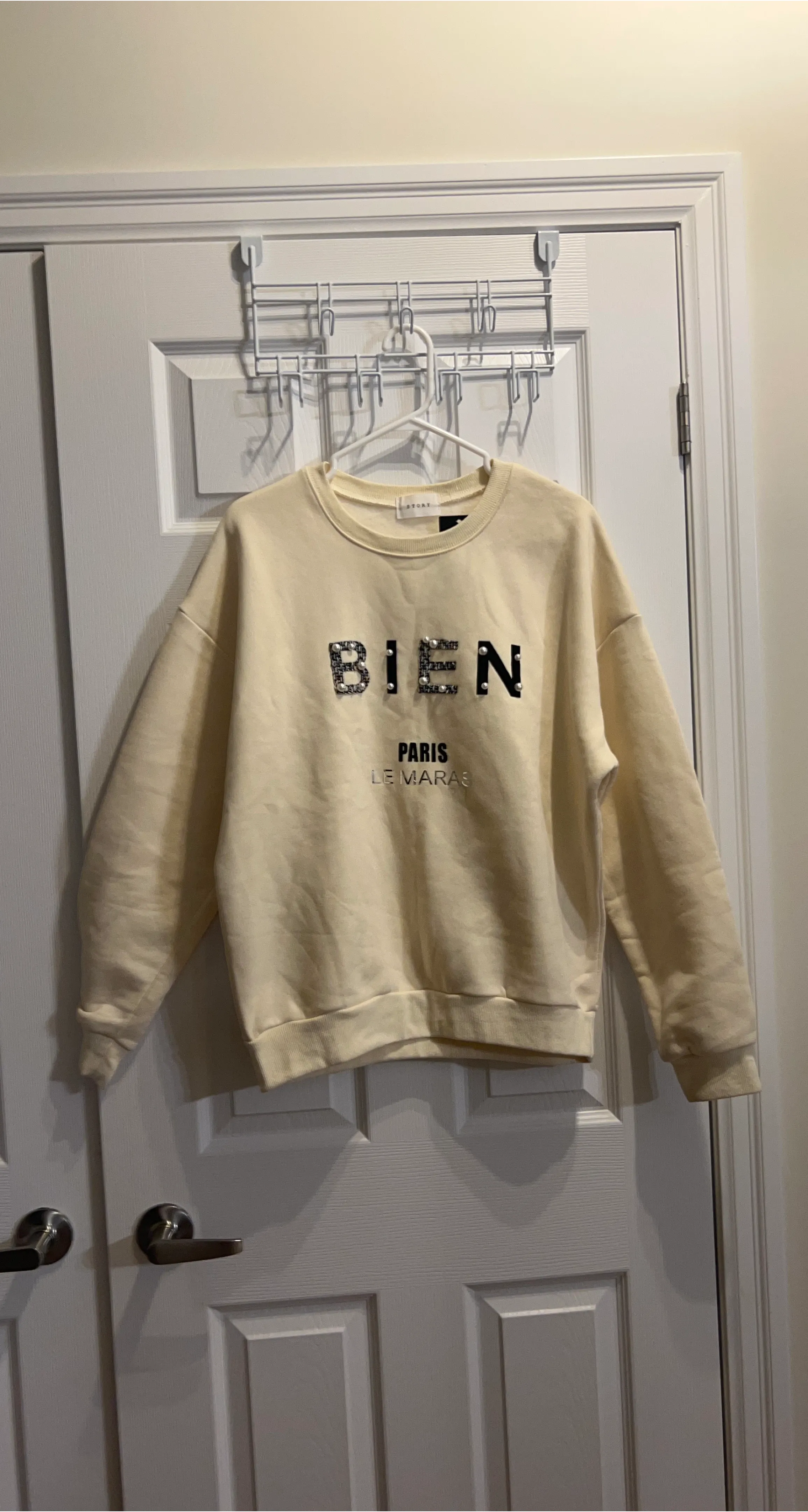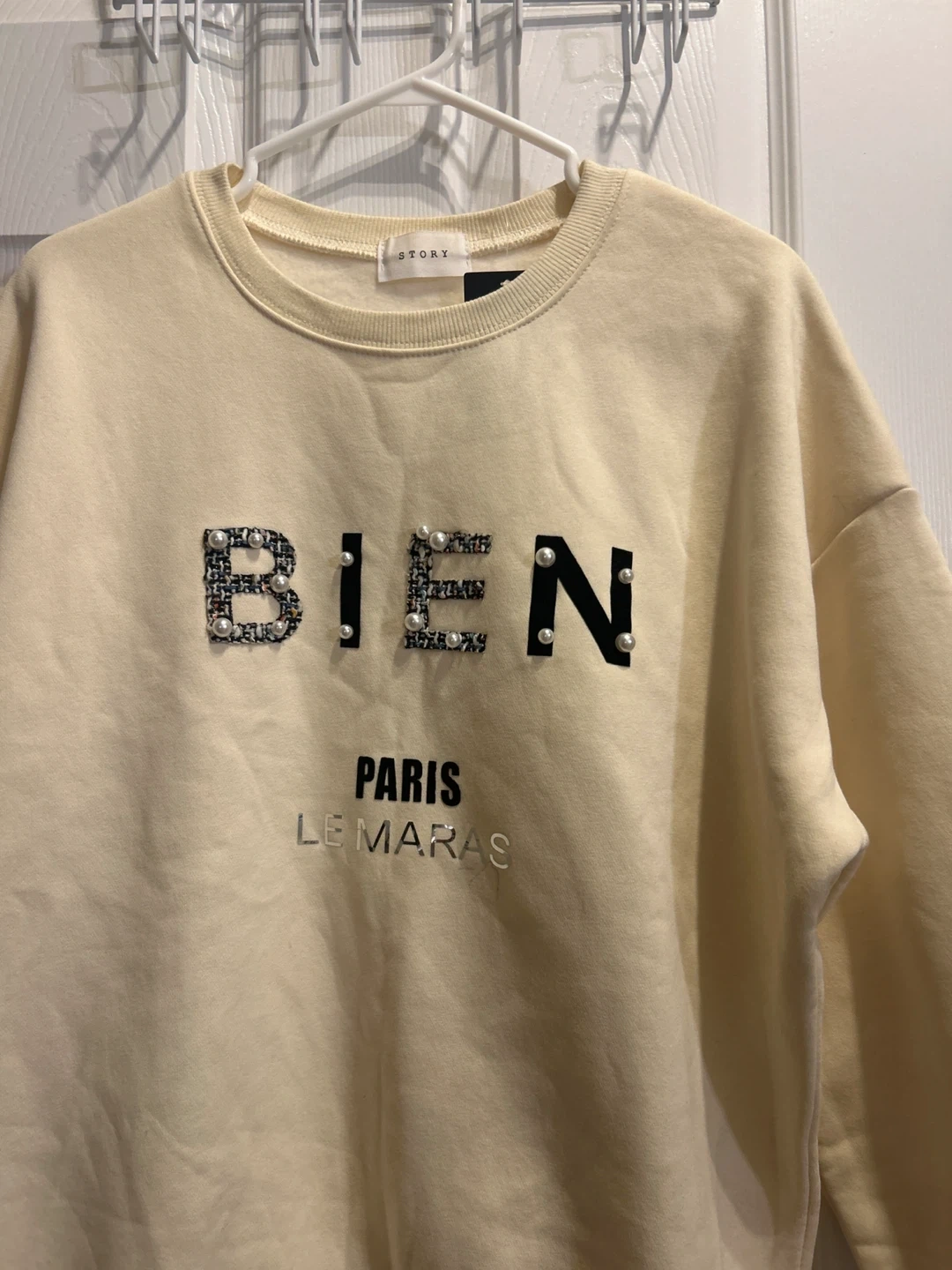 This STORY crewneck sweatshirt features "BIEN" with pearl and beaded accents. It also has "PARIS LE MARAIS" printed below. Inside is fleece lined to keep you warm. Soft and comfortable for everyday wear.