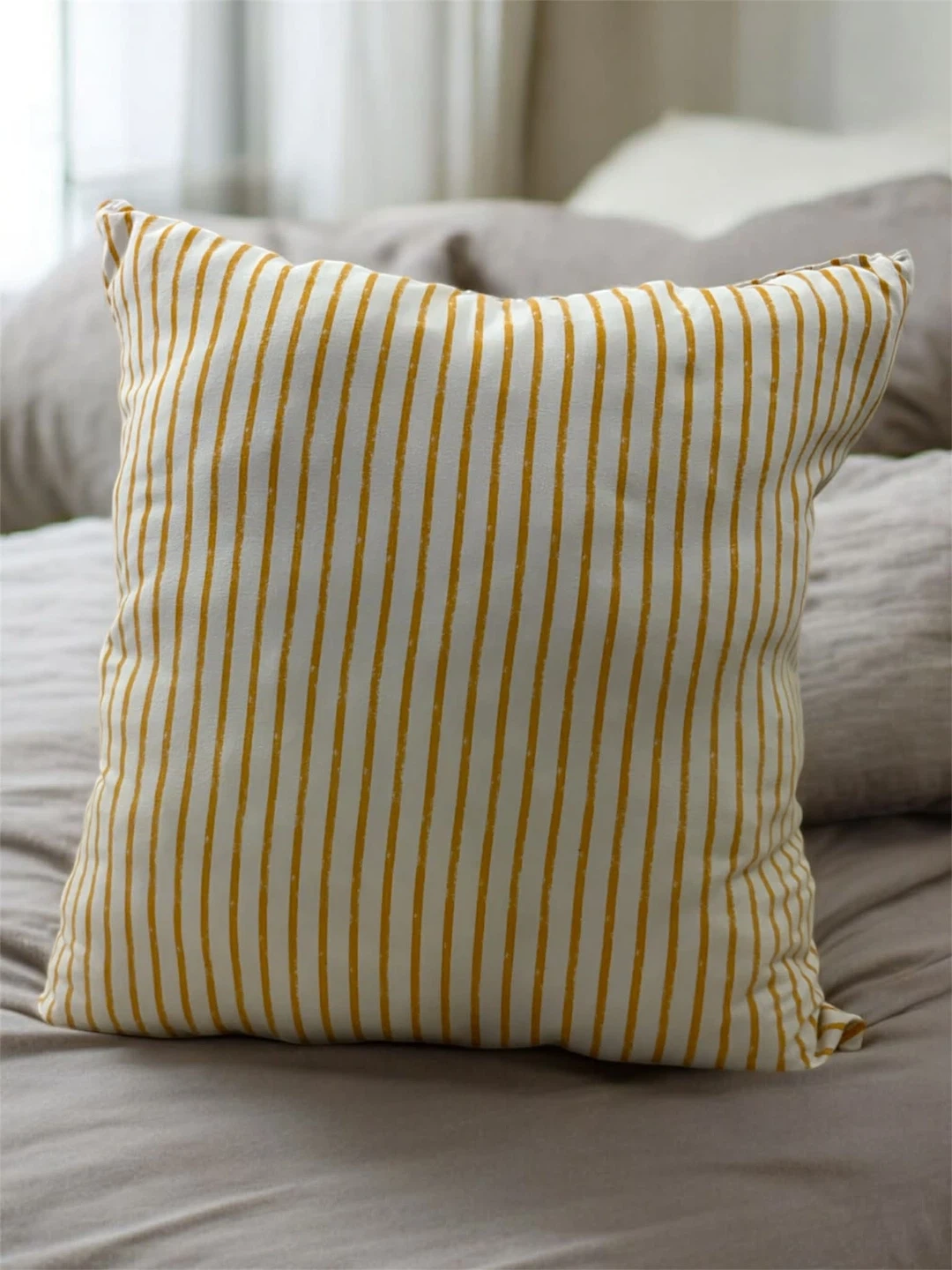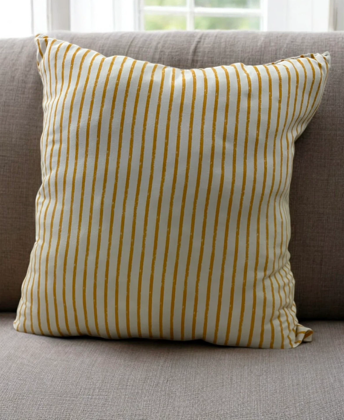 3 throw pillows Adds a cozy touch to your living space. It's a square pillow with a classic stripe pattern in yellow and white. It's great for your sofa or accent chair or bed