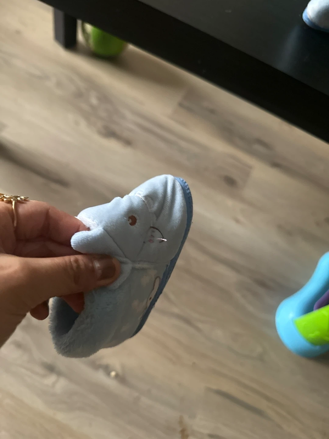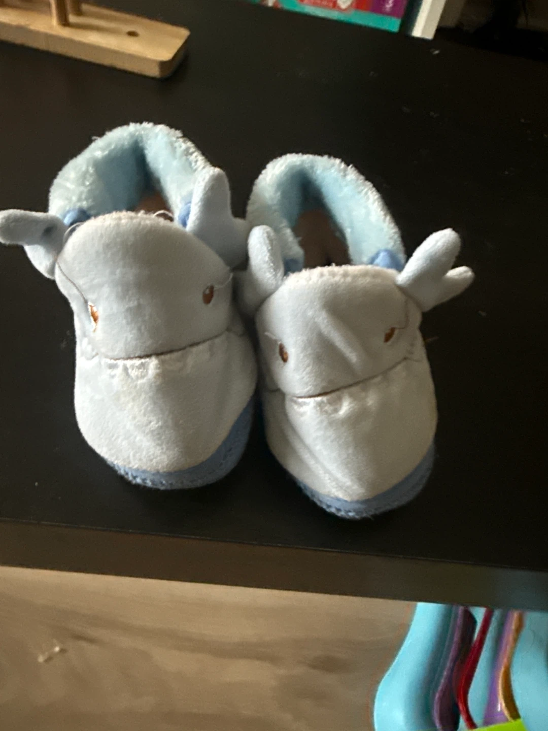 Super soft and cozy light blue baby slippers shaped like whales. They're plush and perfect for keeping little feet warm. These booties have a comfortable fit for infants.