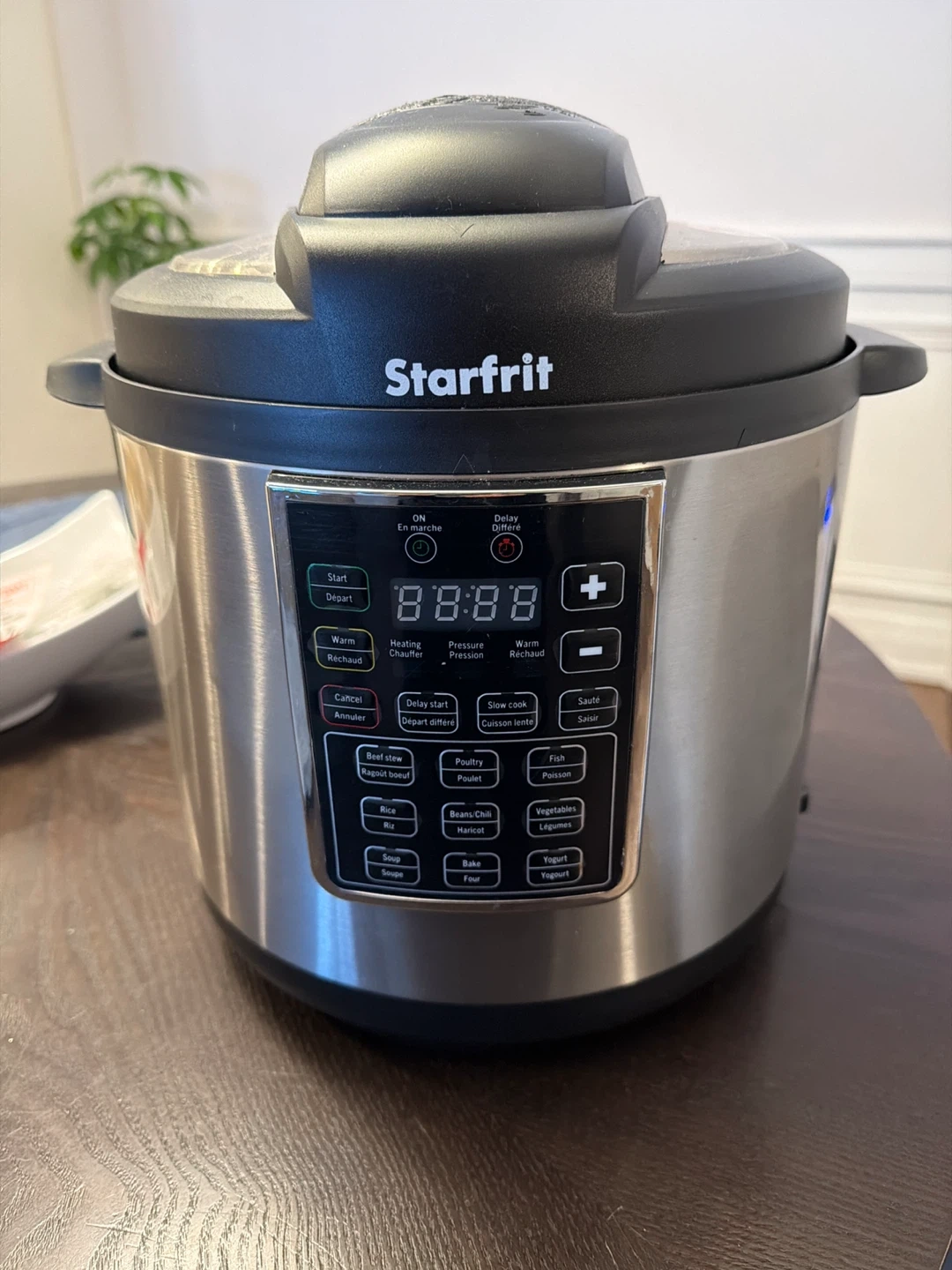 This Starfrit multi-cooker offers various cooking functions. It has settings for Pressure Cook, Slow Cook, Sauté, and more. Perfect for preparing diverse meals efficiently at home!