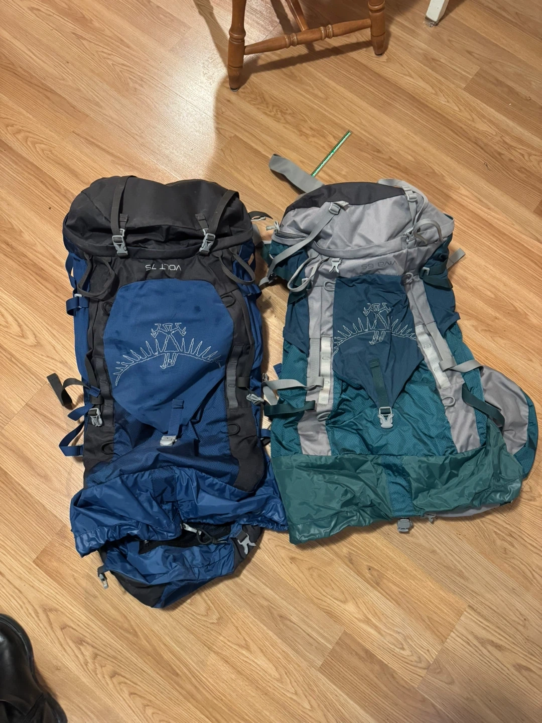 Two Osprey backpacks are available, including the Volt 75 model. Both are designed for hiking and camping. They feature adjustable straps and multiple compartments for gear.