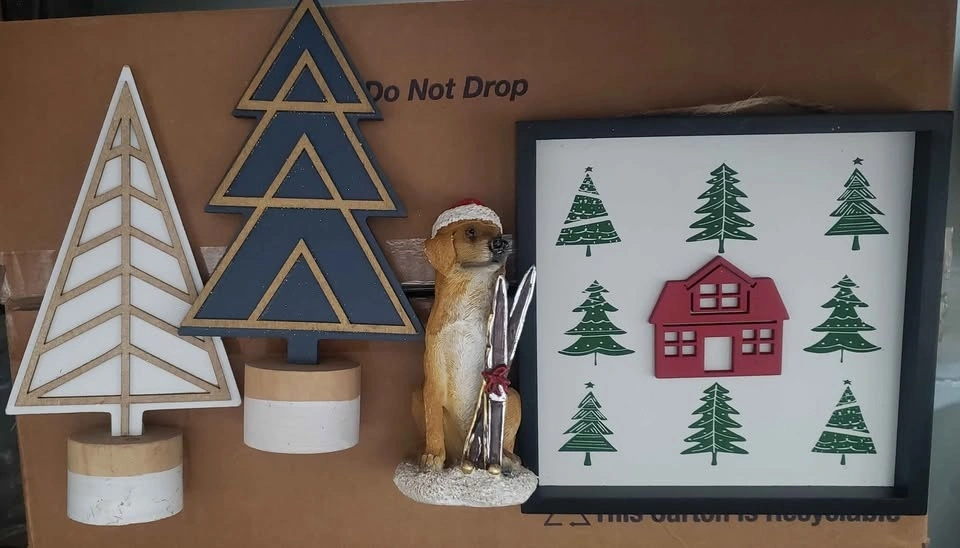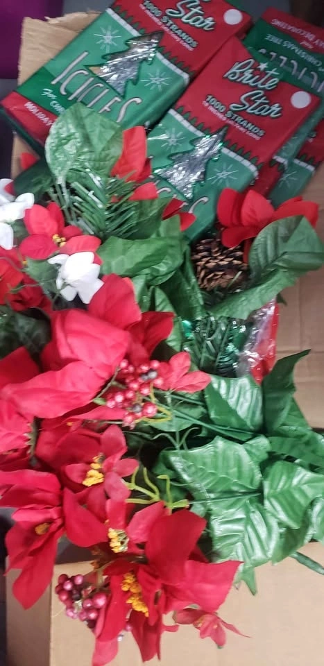 Festive Christmas decor lot! Large assortment of over 150+ items including Brite Star icicles (1000 strands!), mini monogram stockings (8 inch, new with tags), peel & stick gift bows, wooden Christmas trees, a cute dog with skis figurine, a framed sign with trees and a house, metal gift card holders, and some pretty poinsettia and foliage decor. Items are new. Great for decorating or gifting! Pickup in Hicksville NY. $60 or best offer.
