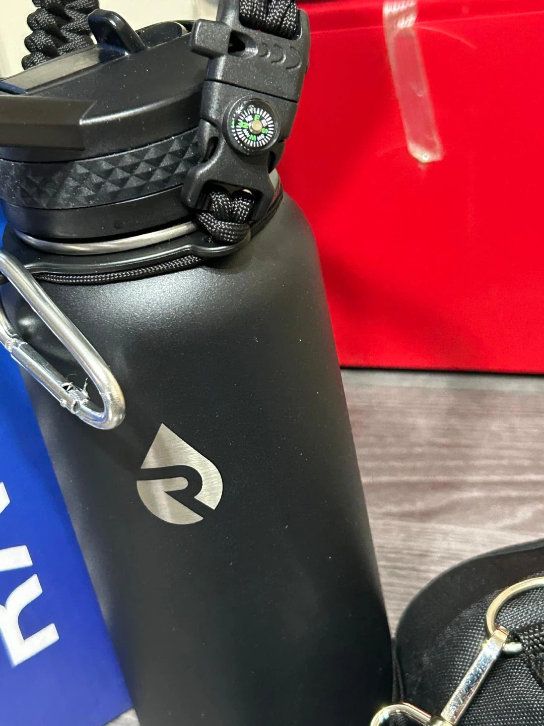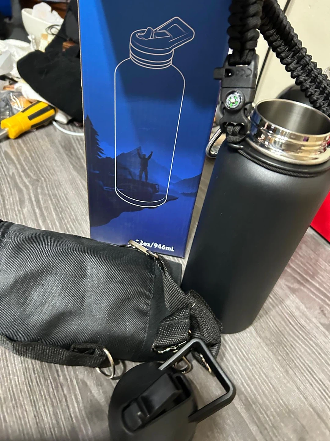 This RAYMYLO insulated water bottle is 40 oz and made of stainless steel. It's black with a paracord handle and straw spout lid. It's great for keeping drinks cold for up to 48 hours!